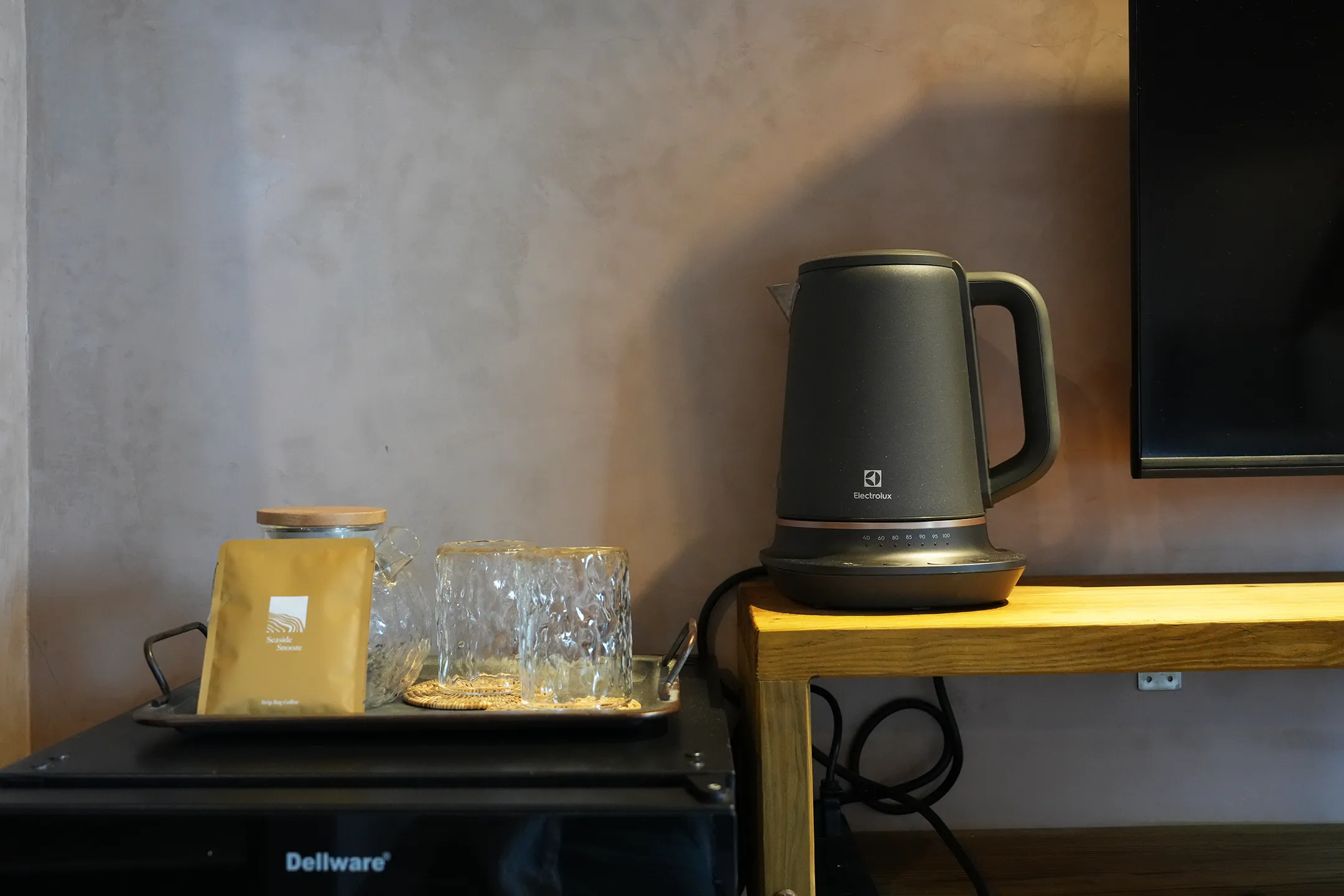 ▼房內有濾掛咖啡兩包、玻璃茶壺茶杯組與熱水壺,對愛喝咖啡的我來說,不用出門找咖啡廳,就在房裡慢慢沖一杯,看著窗外發呆,假期的感覺又更再濃了一點。