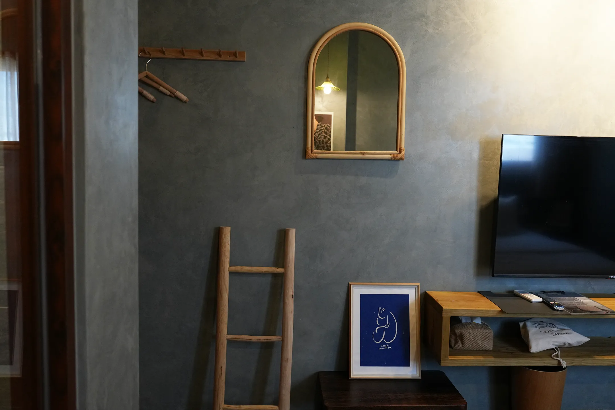 ▼牆上掛著一面拱形鏡,旁邊一組木製掛衣架,最吸引我的是那把原木梯,作為房間內的裝飾真的很特別,我猜應該會有人拿來掛毛巾。電視櫃旁還放了一幅深藍底色的線條插畫,跟整個房間的藍灰色調呼應得恰到好處,非常的有巧思。