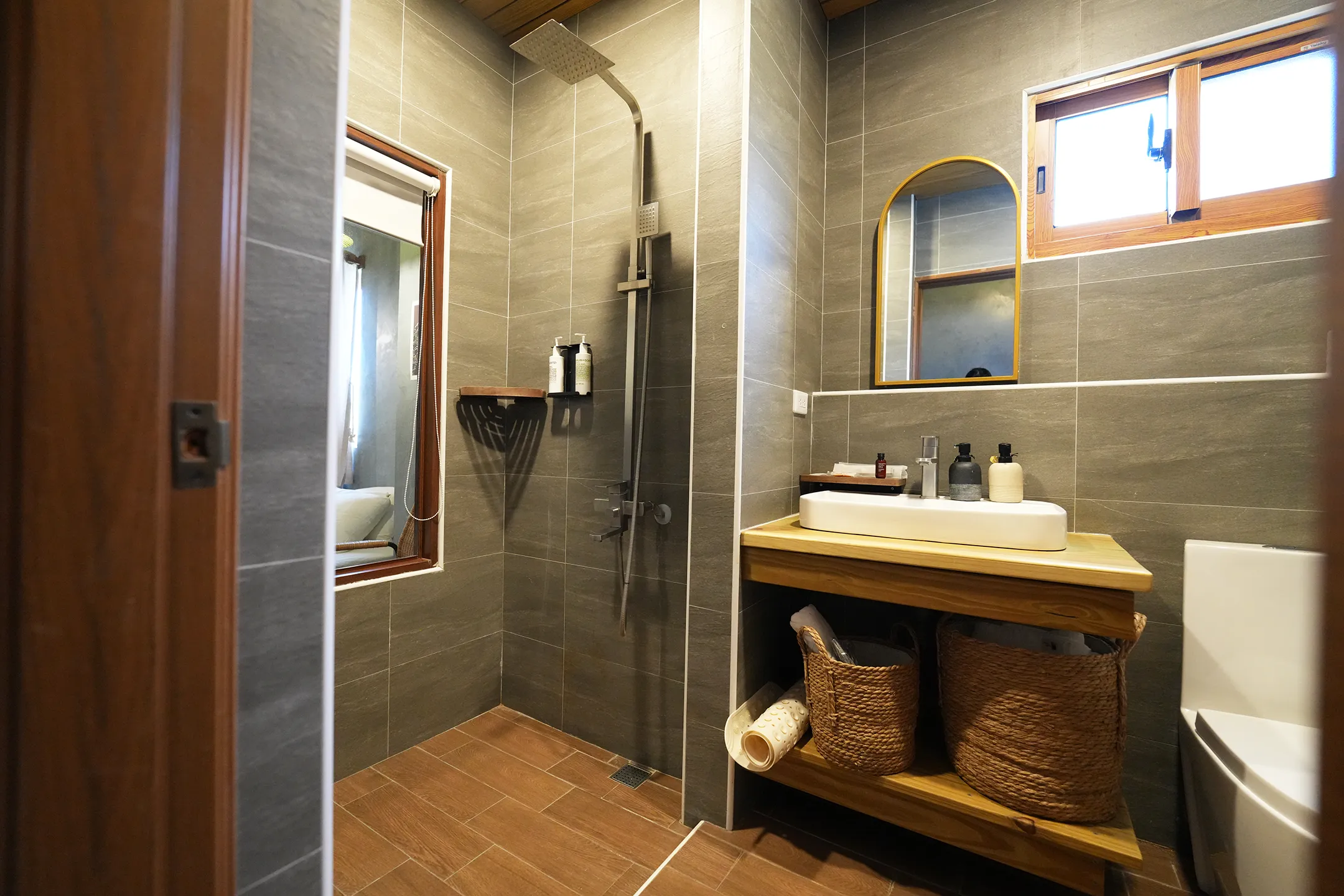 ▼「千草」的衛浴空間分為:淋浴間、洗手台、馬桶,比較麻煩的是淋浴間跟洗手台中間沒有門分隔,洗澡的時候還是要很小心,以免噴的整間都是。洗手台同樣有拱形鏡,框是金色的,細節和房間內的鏡子呼應,有一致性。木質檯面下方用藤編籃收納備品,實用又好看,不會讓空間顯得雜亂。