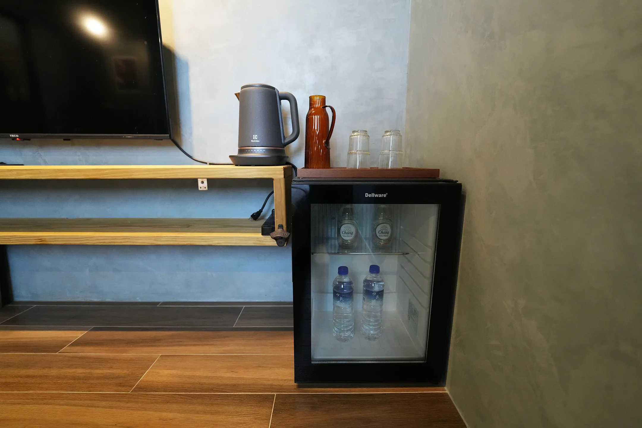▼Mini Bar提供:礦泉水、泰象氣泡水、熱水壺、冷水壺、玻璃杯。