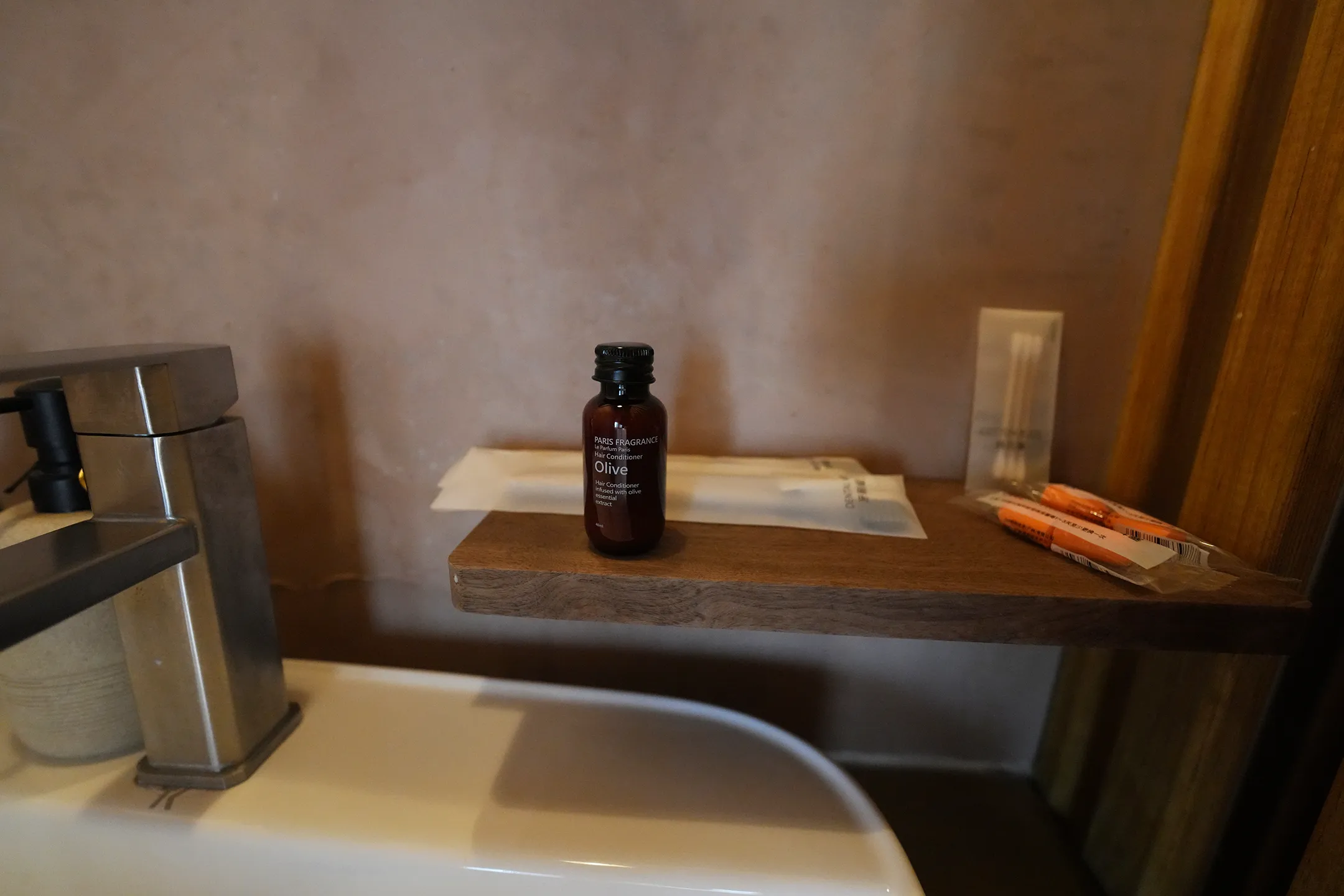 ▼洗手台除了有洗手乳外,還有游泳後可以清洗泳衣或衣服的手洗精,木板層架則是放:護髮素、牙刷牙膏、耳塞、棉花棒,備品裡有附護髮素,對我來說真的是一大驚喜,不過要特別注意,這瓶護髮素僅供房內使用,是不能帶離民宿的。
