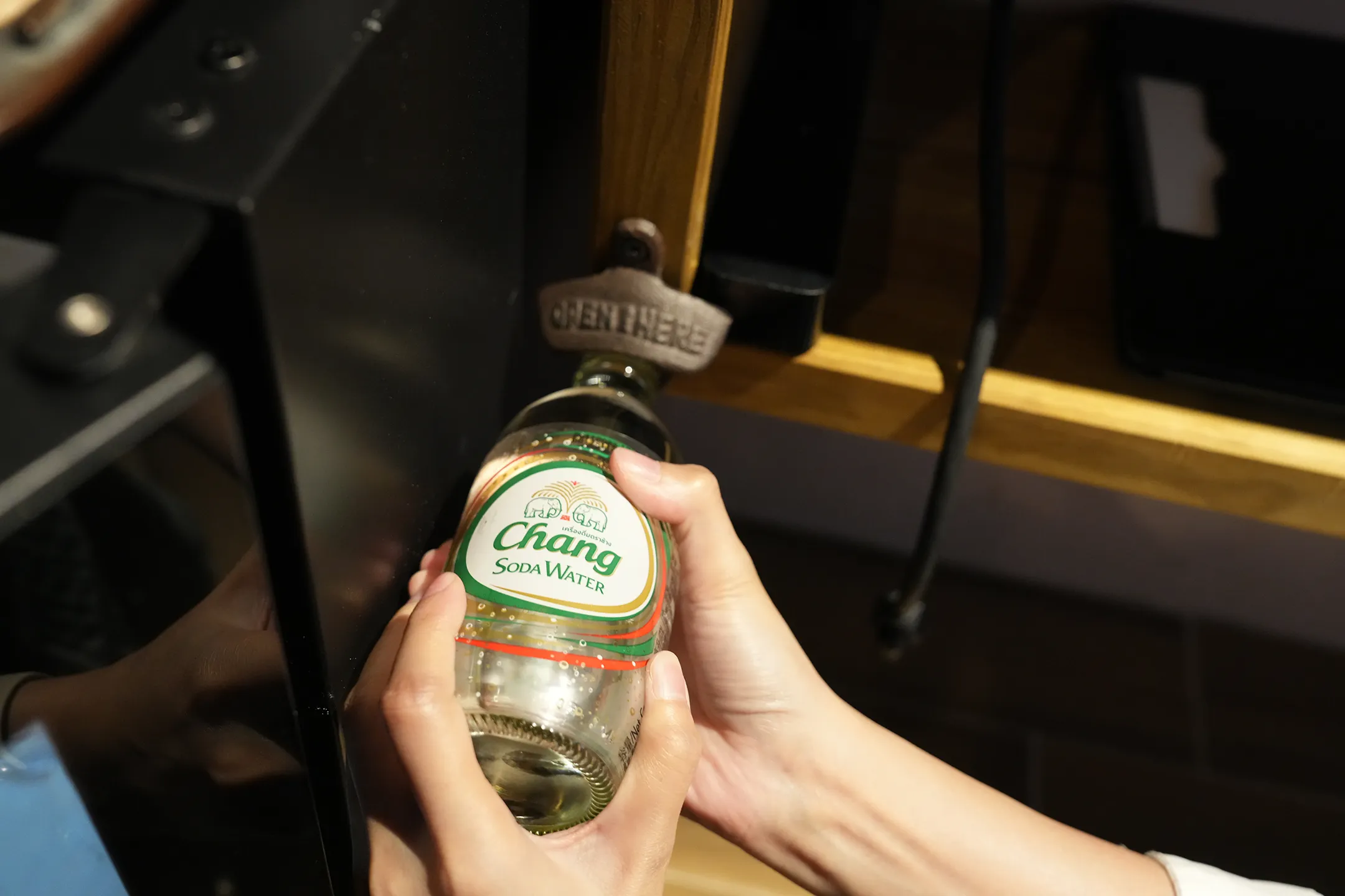 ▼很有趣的是電視櫃裝了一個固定式開瓶器,對準瓶蓋一扳,就可以乾淨俐落的喝到氣泡水。