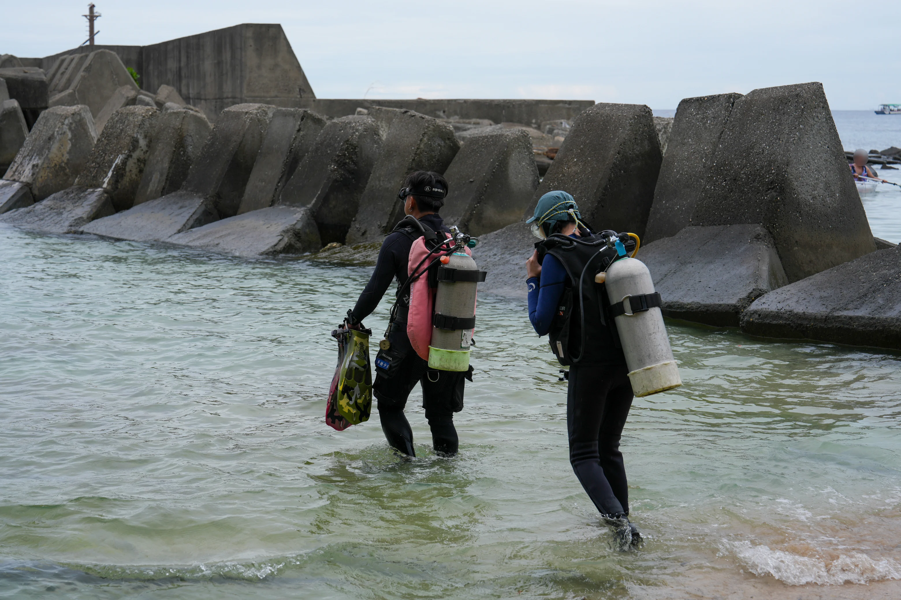 ▼裝備穿完,教練就會帶著學員慢慢走向潛水點,只是整套裝備穿戴在身上時,身體瞬間變得非常沉重,走起路來也有些吃力,幸好這次會由兩位教練一起陪同朋友下水,一位主要負責協助潛水,另一位則主要負責攝影,不僅能讓朋友在水下多一份照應,也能完整紀錄下這段潛水體驗。