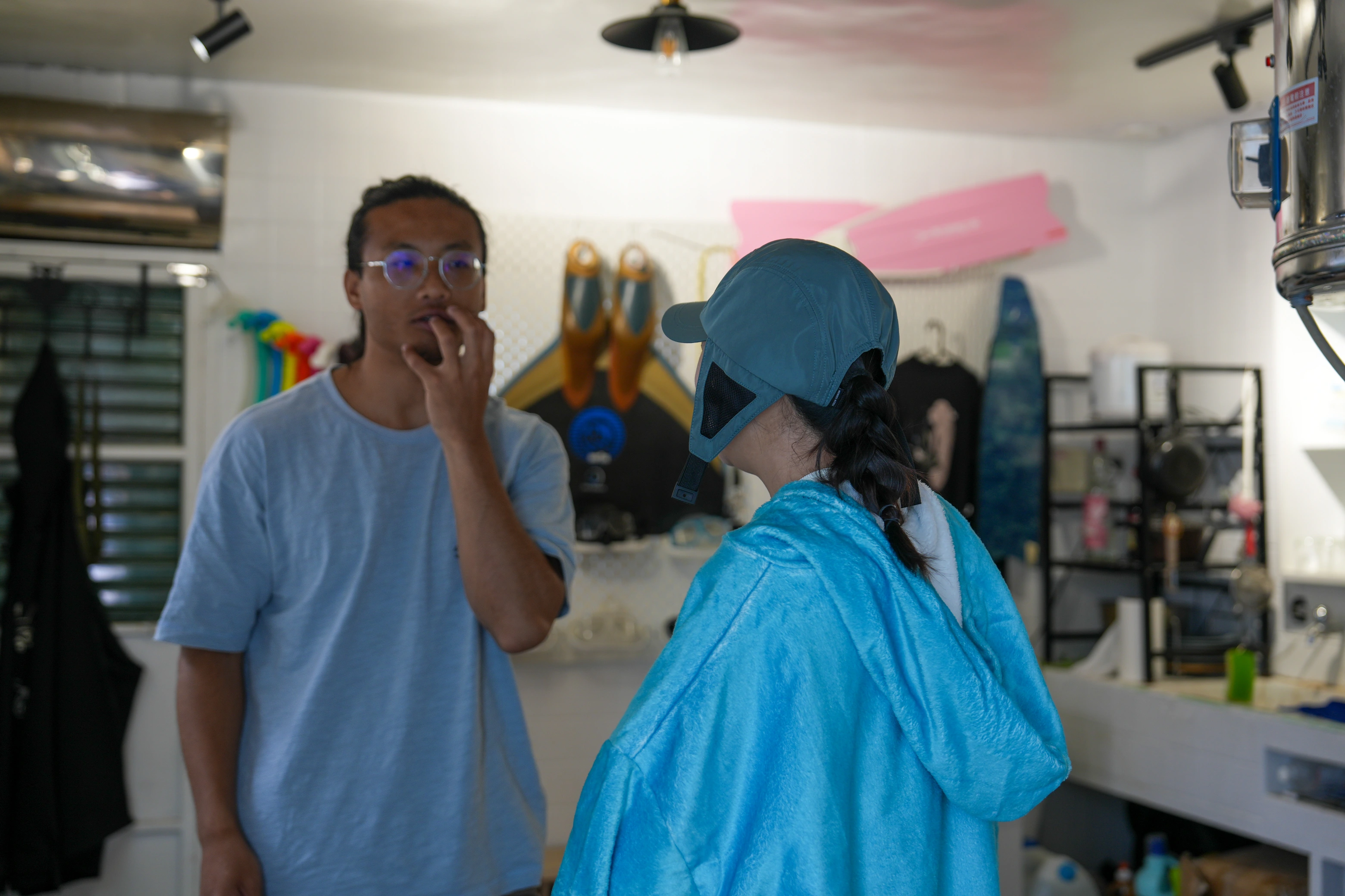 ▼防寒衣穿好後,教練就會帶著學員來到教室外,並拿蛙鞋給學員試穿,教室外的空間也比較有限,朋友就在這邊試穿蛙鞋,確認尺寸合適後,我們便跟著教練前往今日的潛水點—美人沙灘,準備體驗自由潛水。