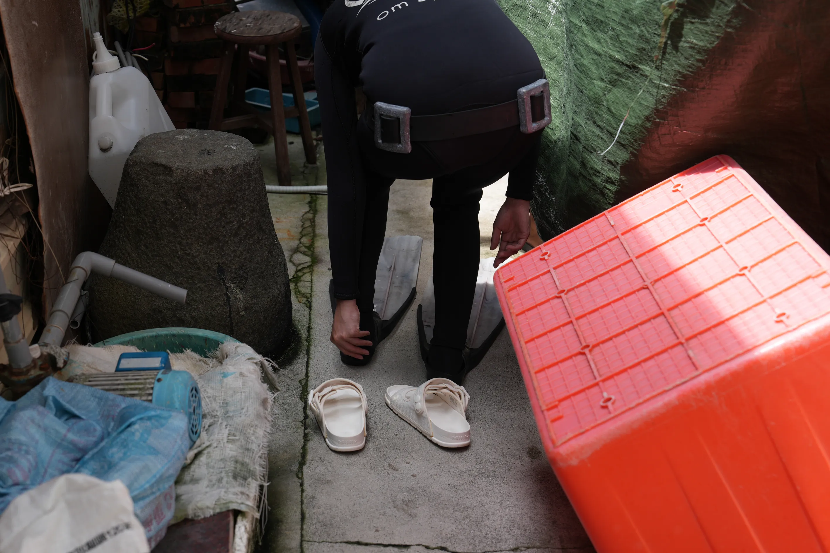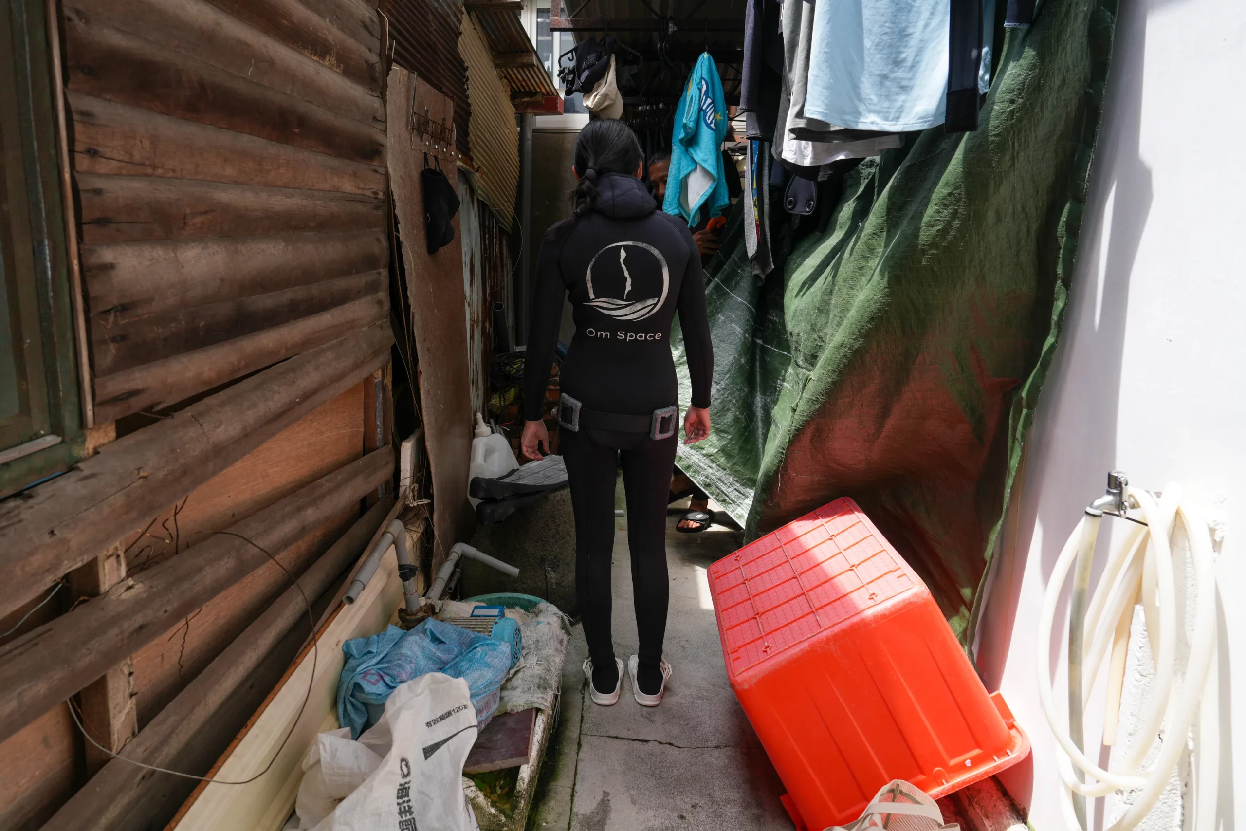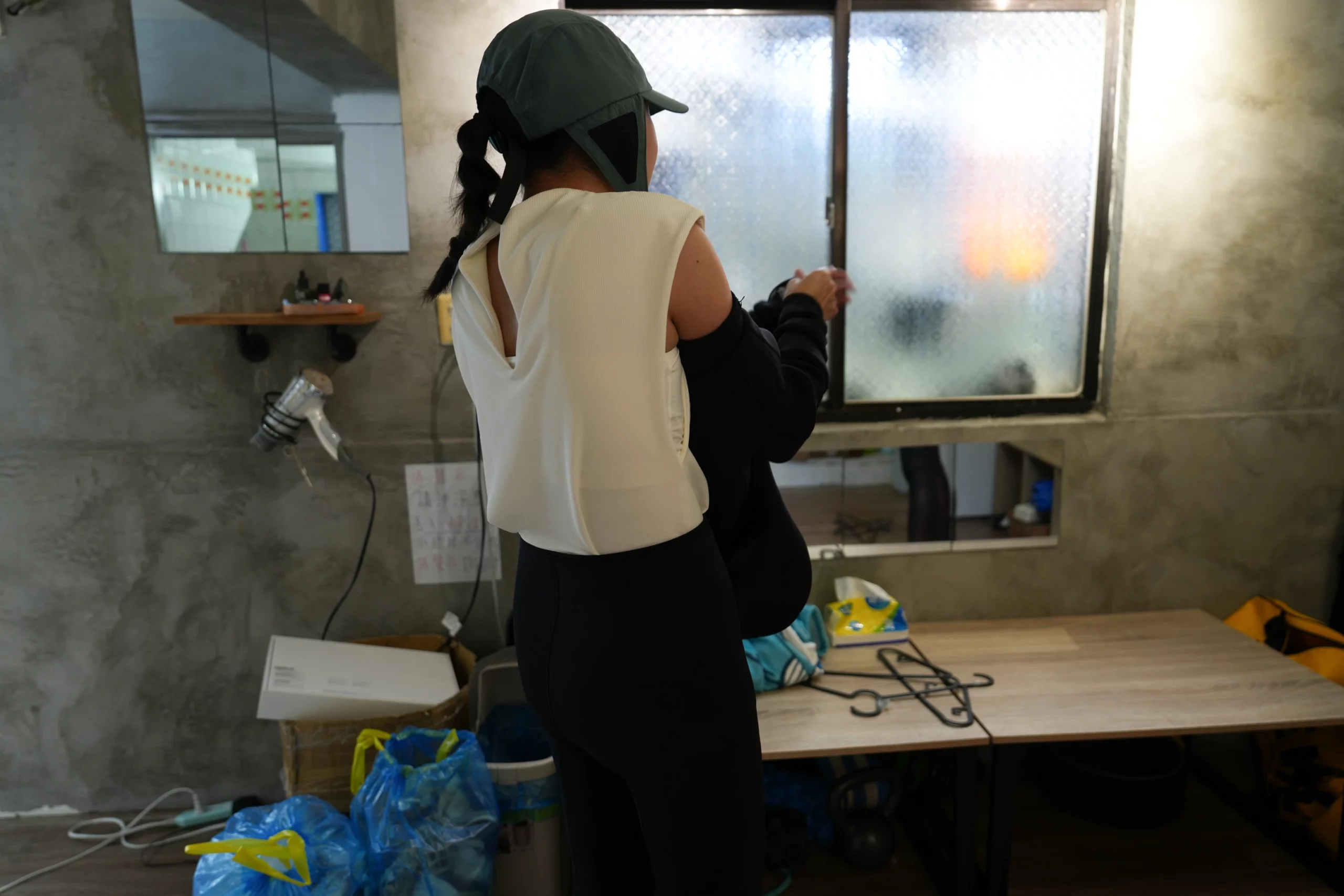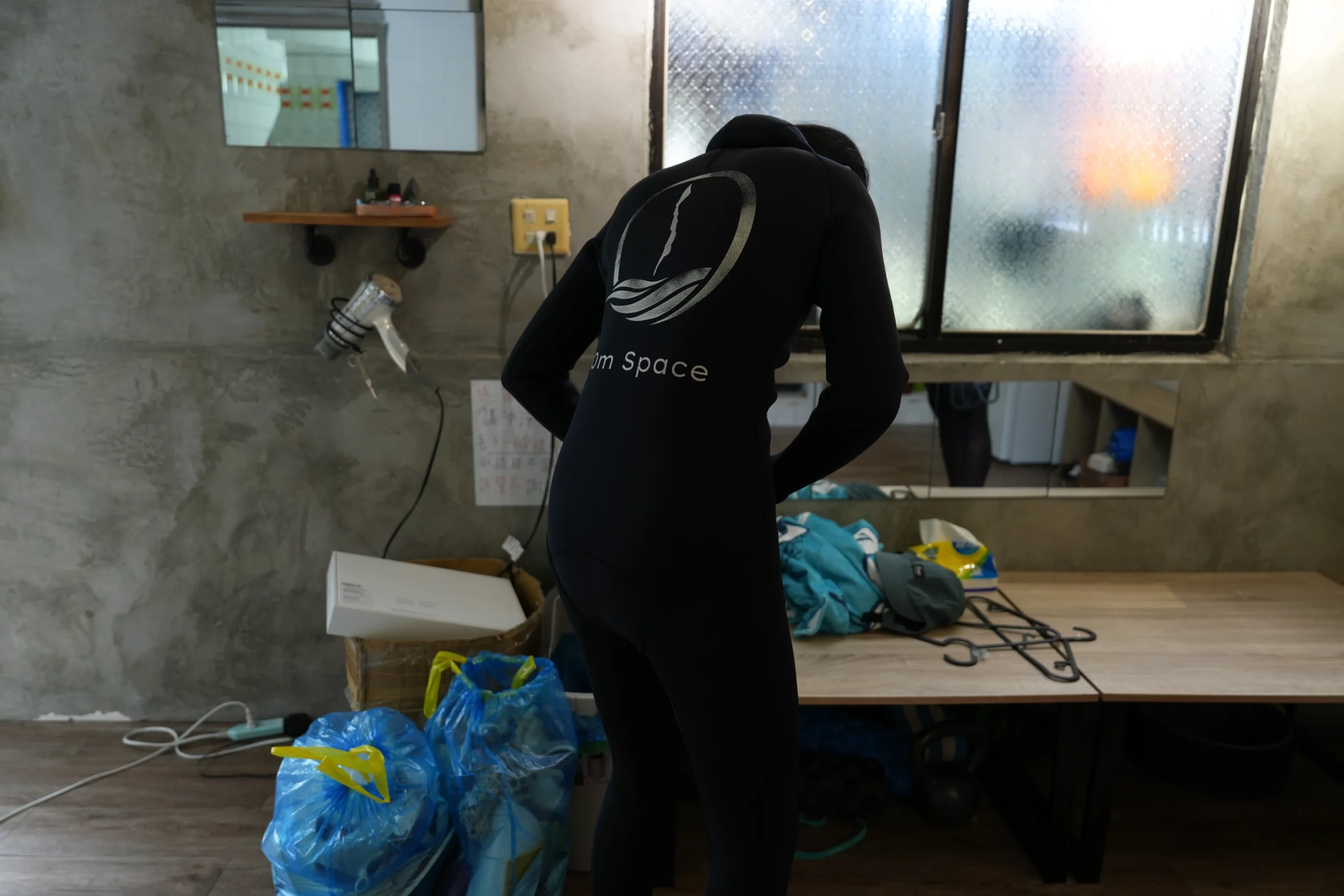 ▼上完廁所後,朋友就在一個很像廚房的空間裡更換防寒衣,由於現場沒有提供椅子,學員只能站著或是直接坐在地上更換,這時需要將緊貼身體的防寒衣一點一點慢慢拉上,整個過程相當費力。