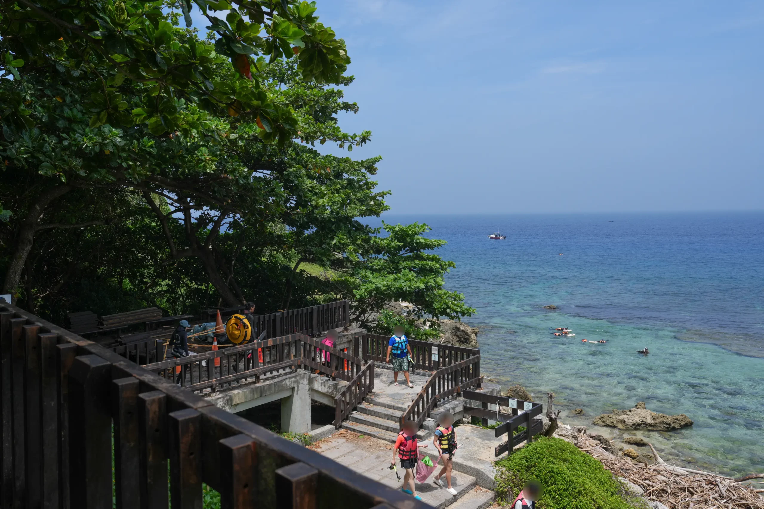 ▼美人沙灘的海水清澈透明、海底能見度高,是小琉球當地相當熱門的潛水勝地,遊客來到這裡,需要先沿著一段樓梯慢慢走下去,才能抵達沙灘。