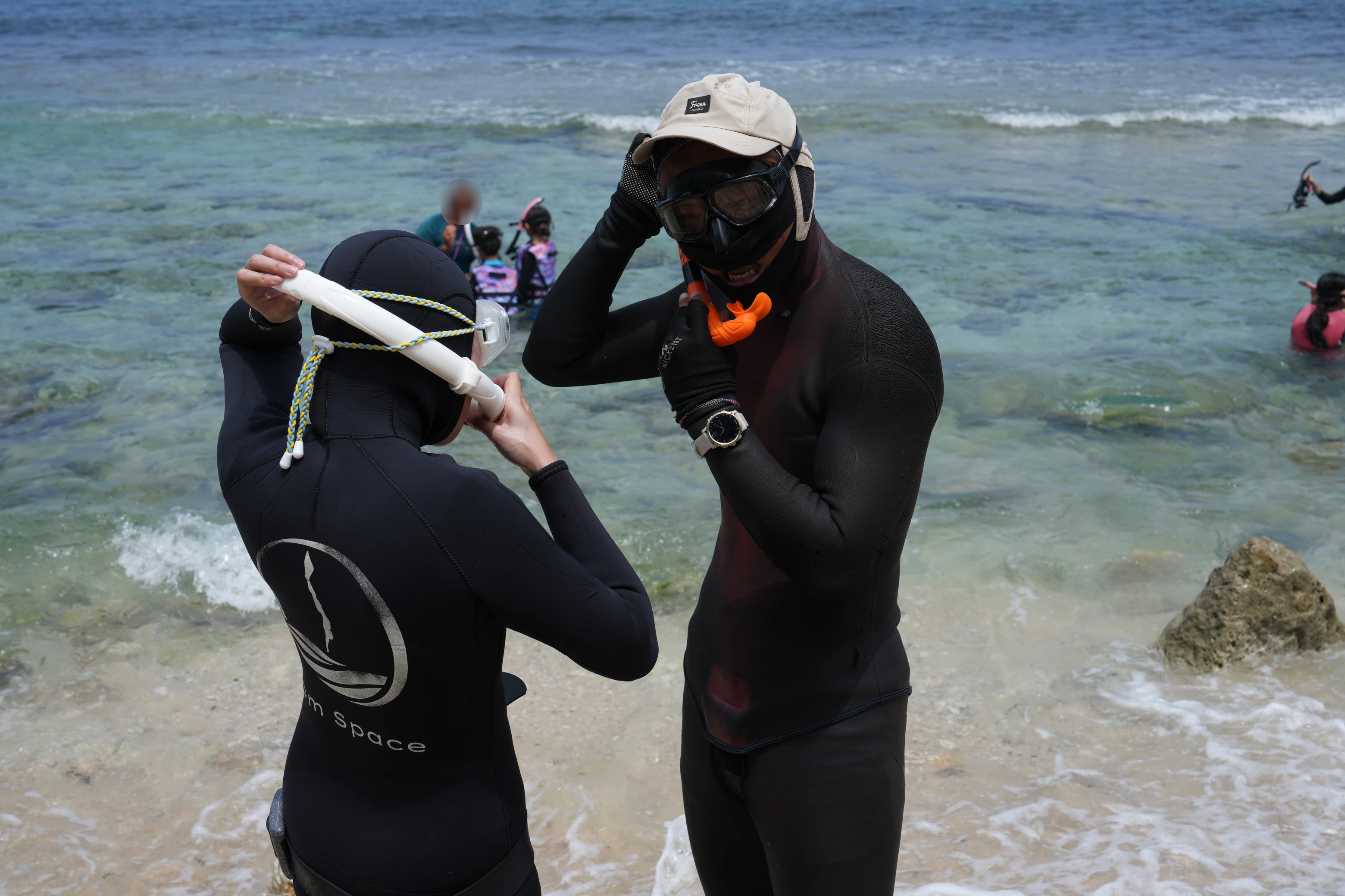 ▼抵達沙灘後,教練會請學員先將面鏡進行除霧,方式是用自己的口水塗抹鏡片,確保下水時不會起霧後,就能戴上面鏡和呼吸管準備下水,這次面鏡和呼吸管朋友都是自備,如果沒有也不用擔心,潛店同樣都有提供,但也幸好朋友這次有帶自己的裝備,不然公用裝備用這樣的方式進行除霧,難免會讓人對衛生問題感到有點疑慮😥