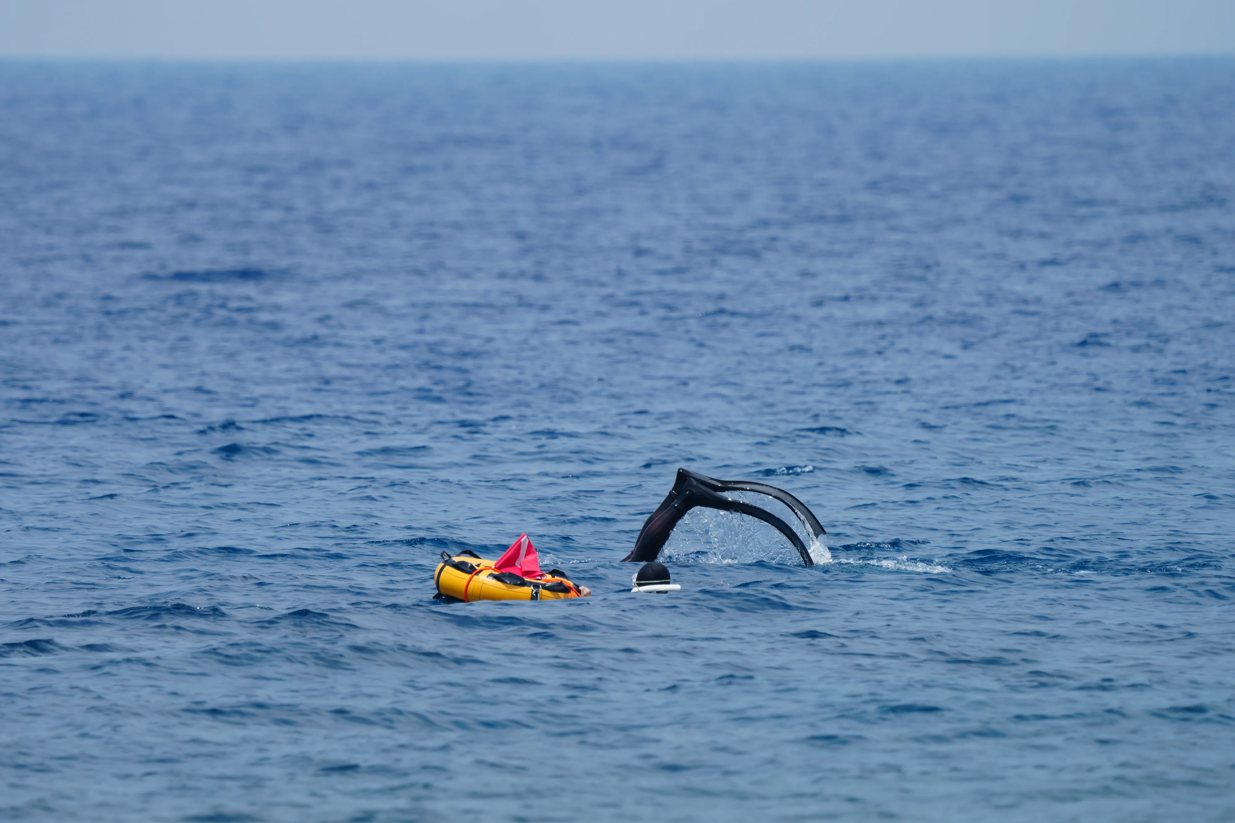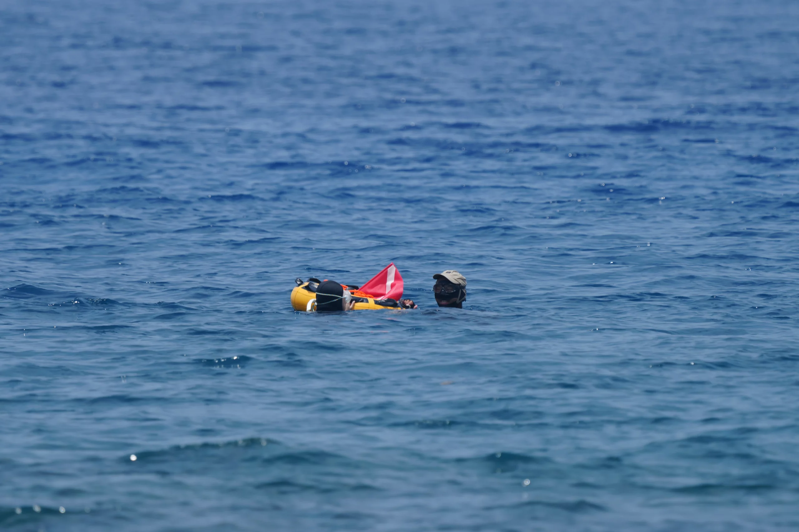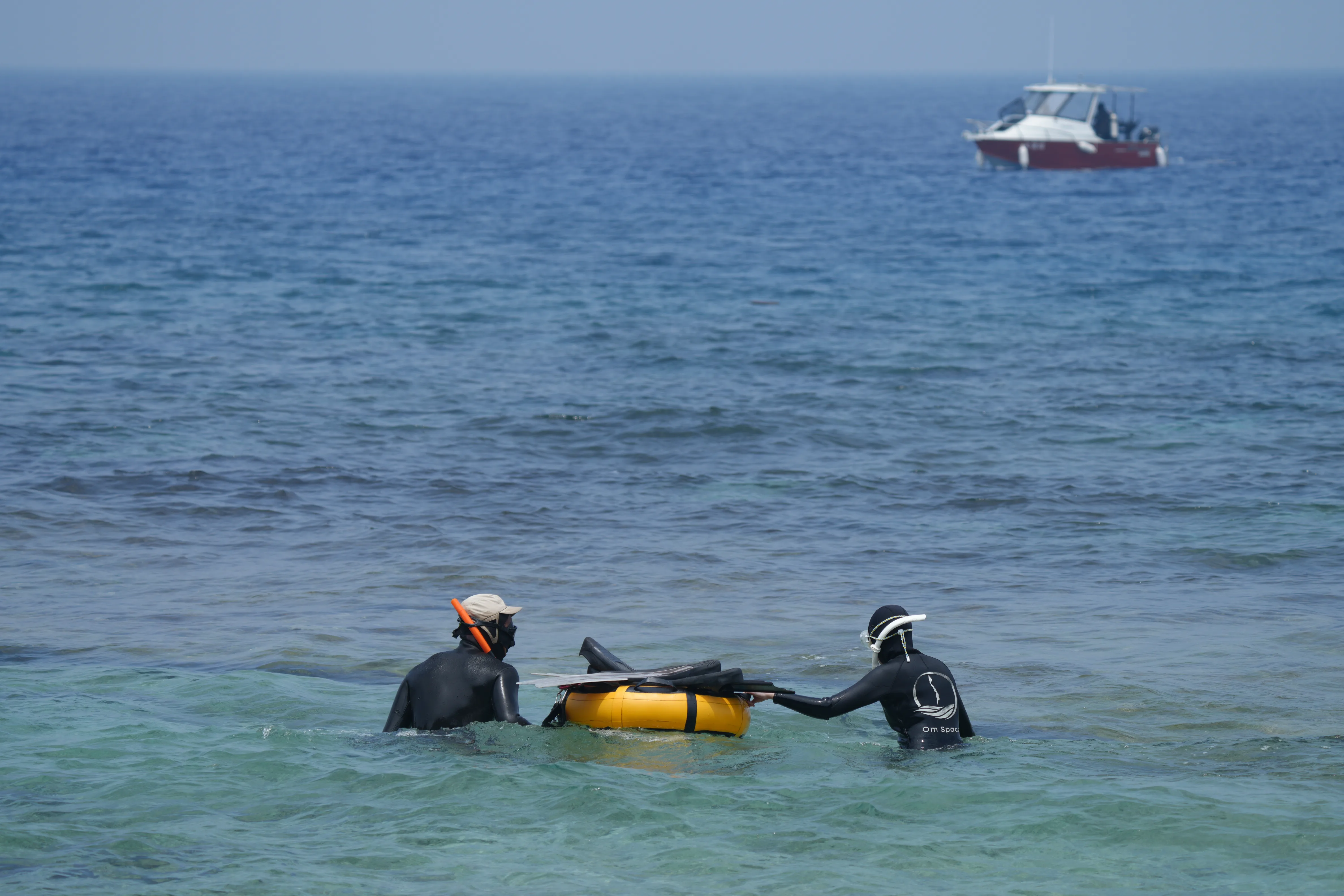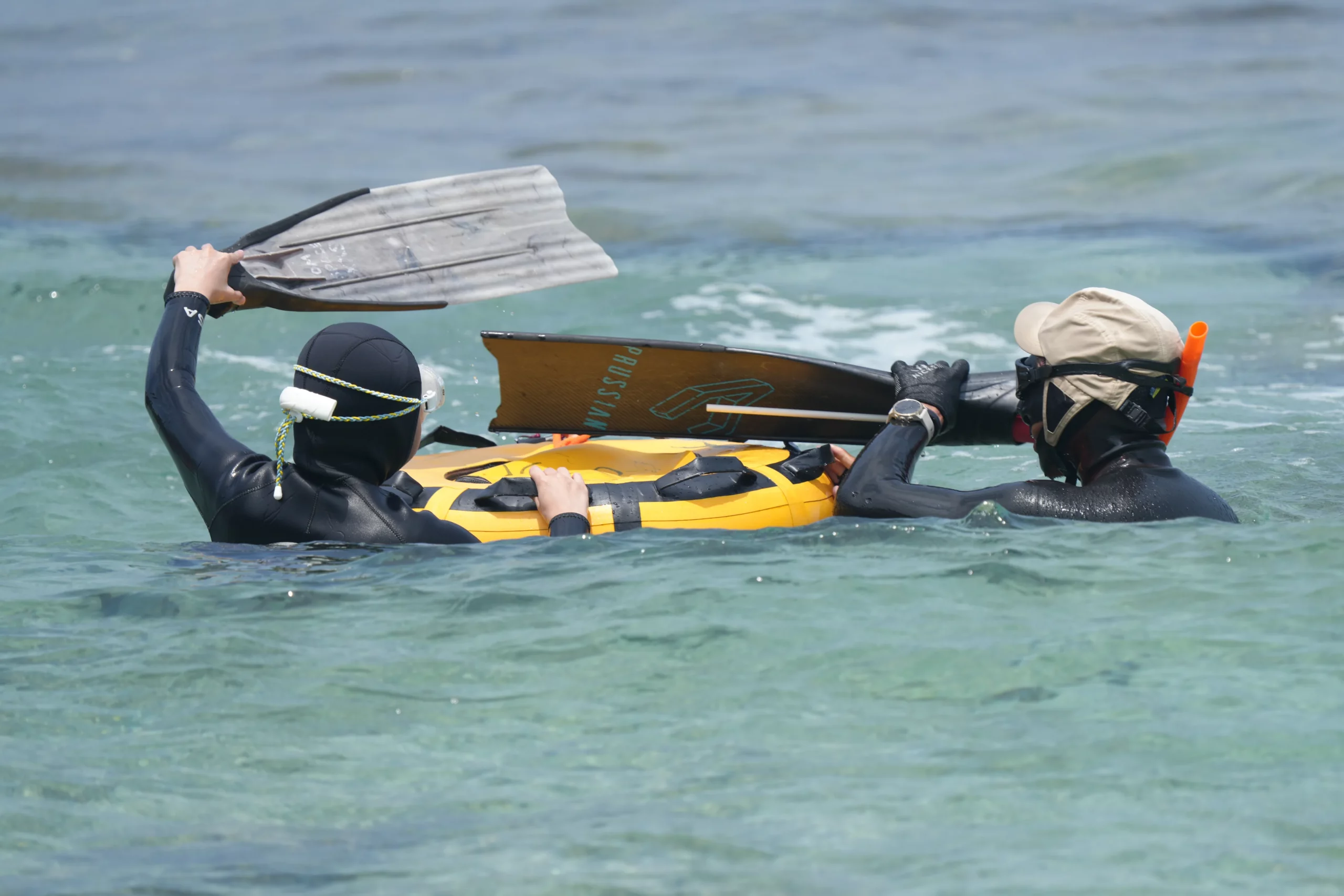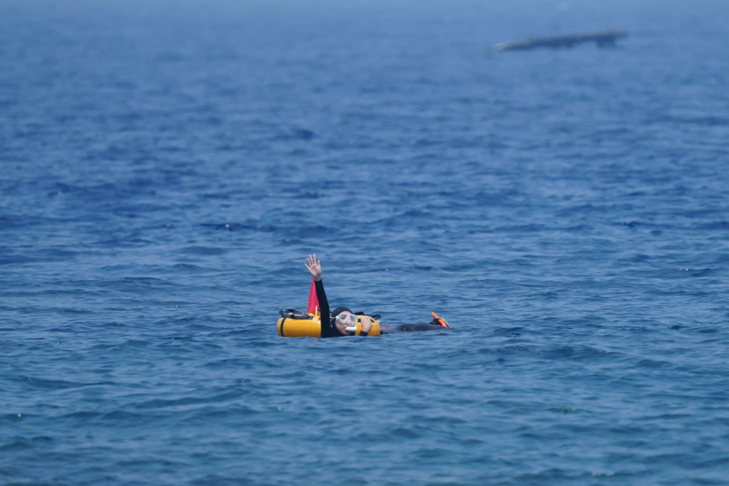 ▼直到抵達適合下潛的水域,教練會先簡單講解攀繩下潛和躬身下潛的技巧,兩者的差別在於,躬身下潛沒有繩索輔助,學員需要先將身體躬身,然後倒立入水,接著手往後撥,等到腳入水後再踢水,講解完教練就會先潛入水下,讓學員自己嘗試攀繩和躬身兩種下潛方式。