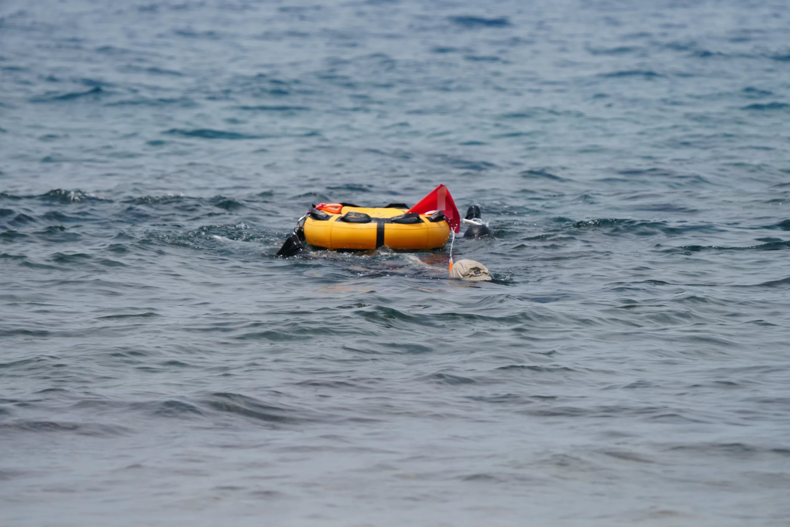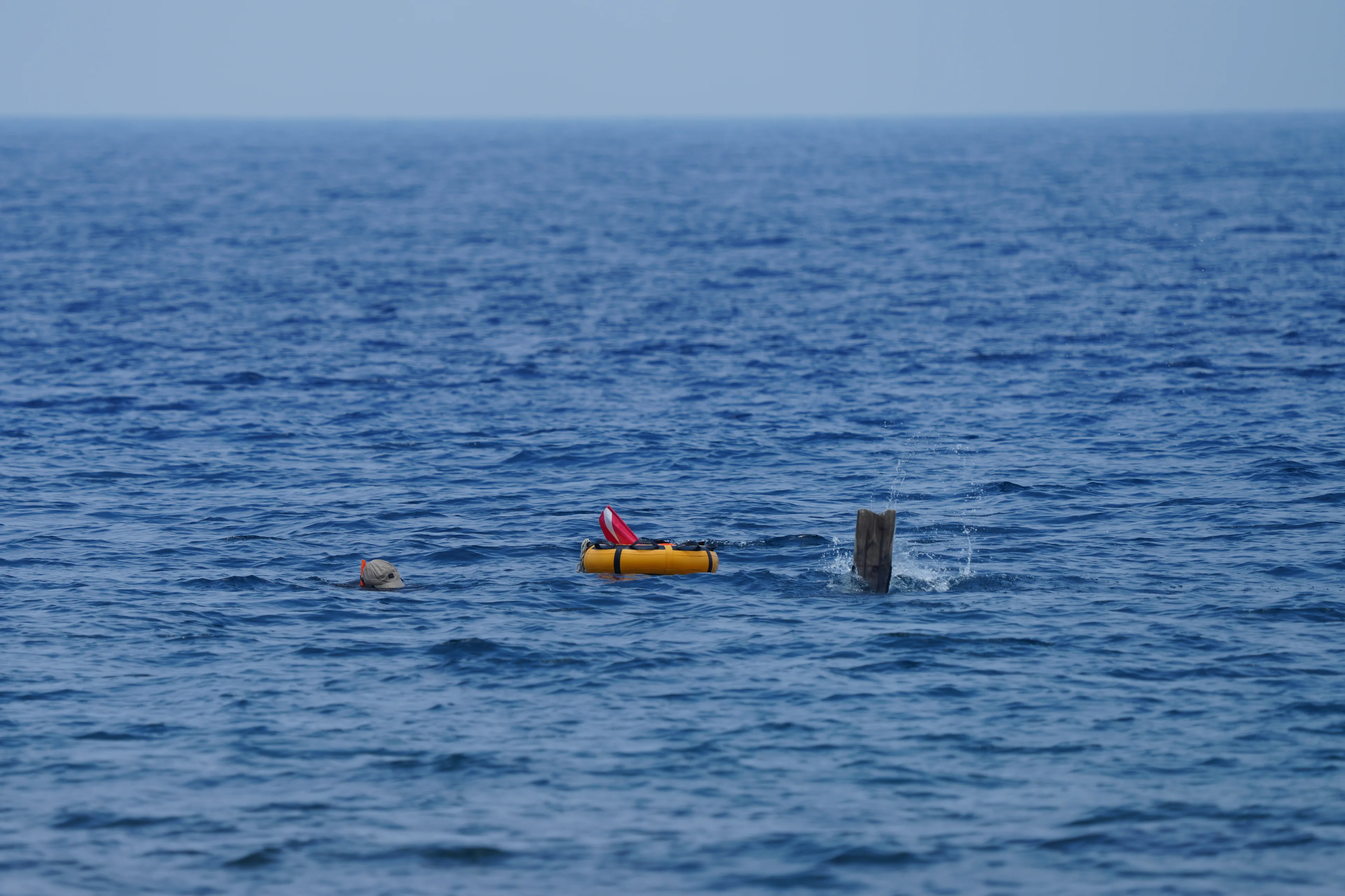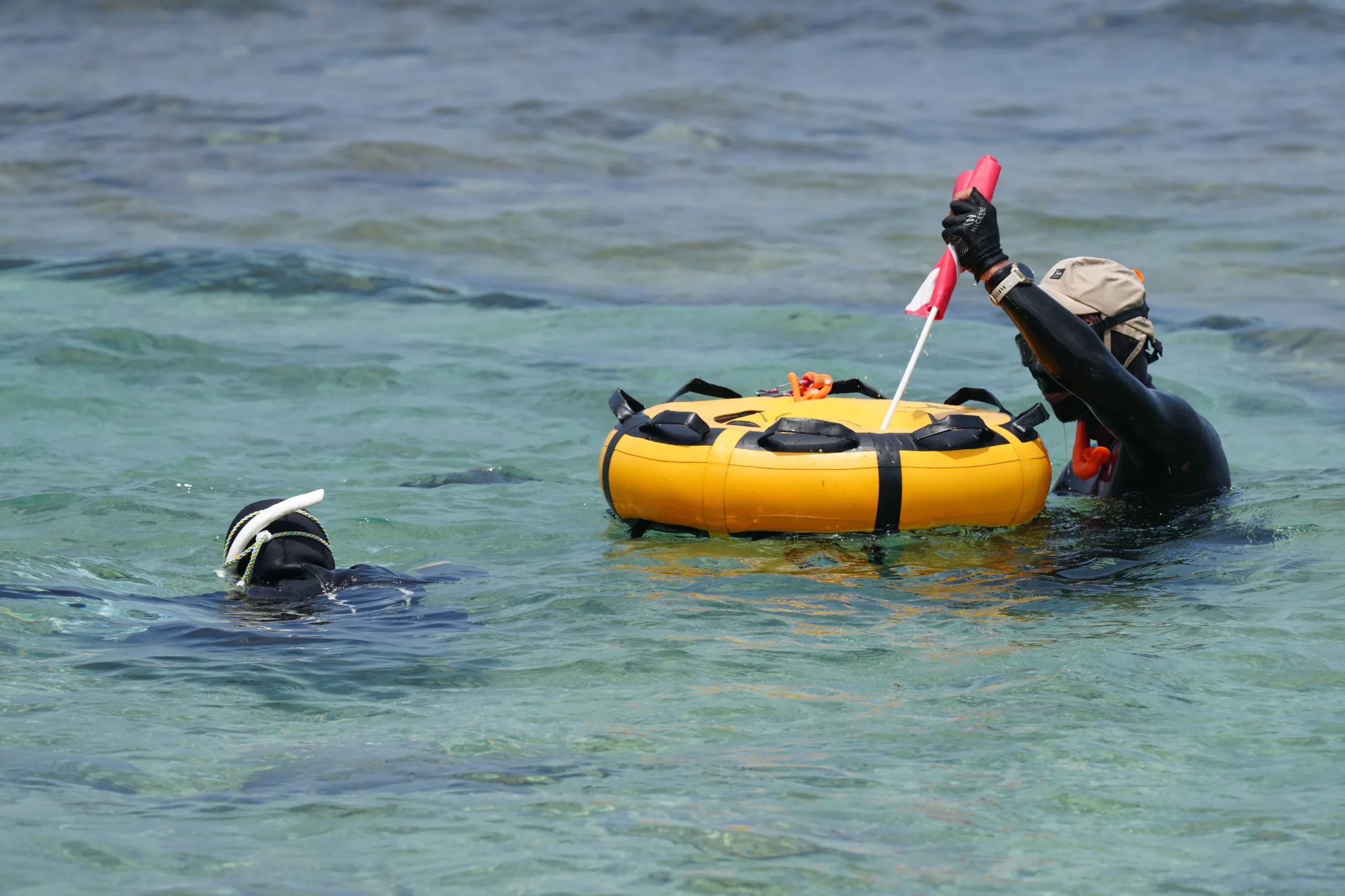 ▼一直到水位較深的地方,教練便會先請學員穿上蛙鞋,隨後再把一面顯眼的紅色旗幟插在浮球上,作為定位標記。