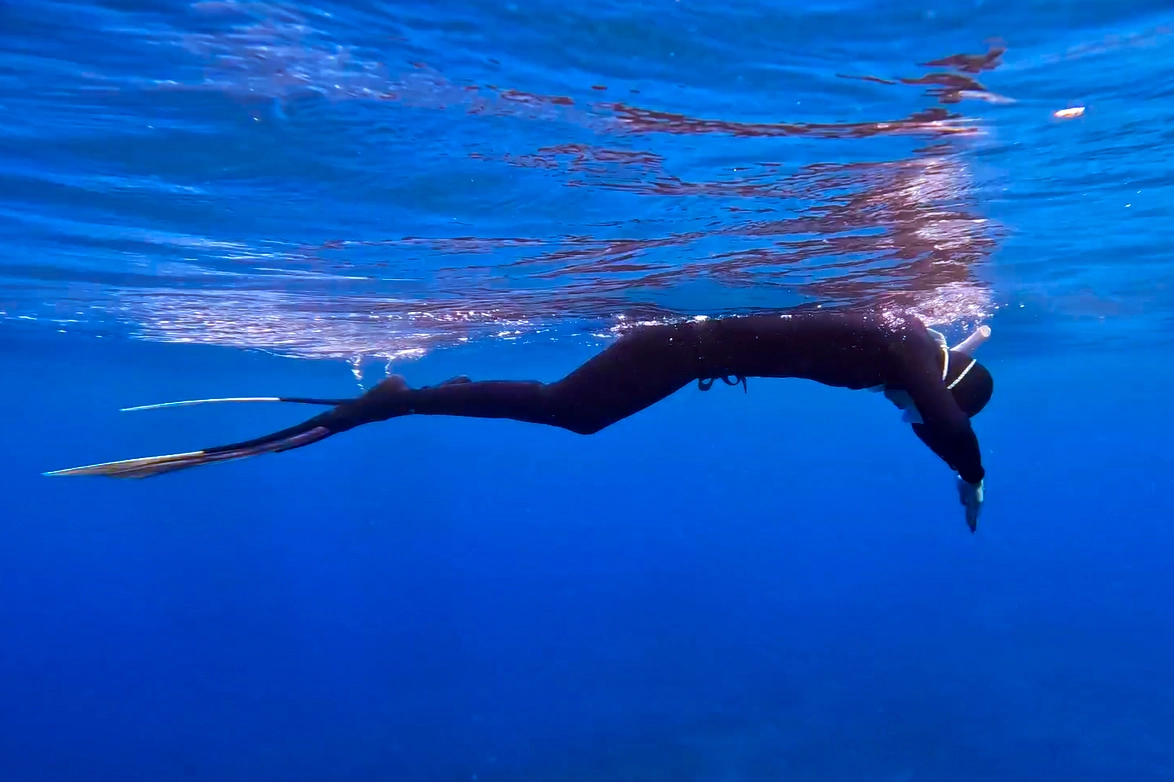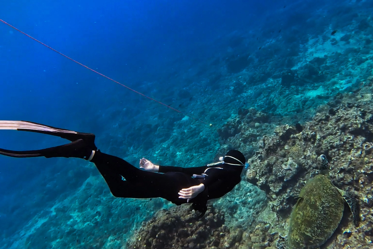 ▼因為自由潛水是需要自己憋著一口氣下潛,感覺快撐不住時再浮上水面換氣,所以想在水下待得越久,就必須學會延長憋氣時間,課程中,教練會指導學員如何把空氣先吸進胸腔,再延伸到腹腔,盡可能地讓身體儲存更多氧氣後再開始憋氣,隨著憋氣時間越長,身體會開始出現緊繃、發熱等不適感,這時就需要靠意志力撐到無法維持時才可以換氣,換氣的瞬間,身體就會像剛跑完800公尺一樣非常喘。