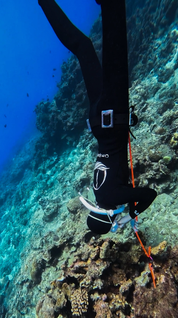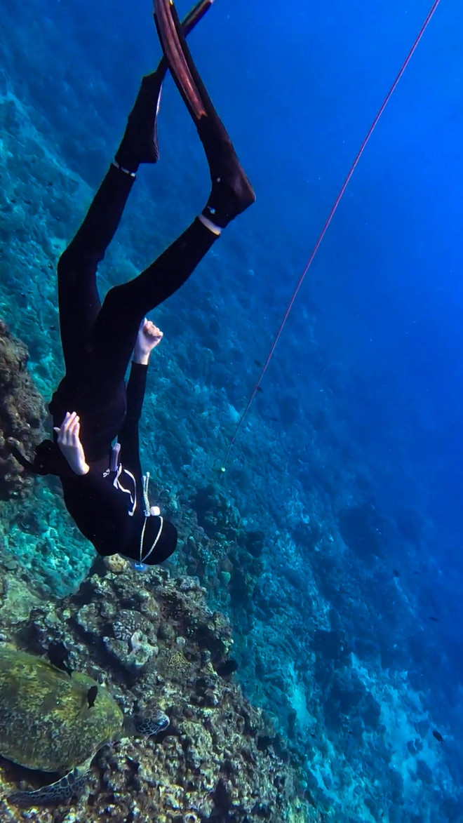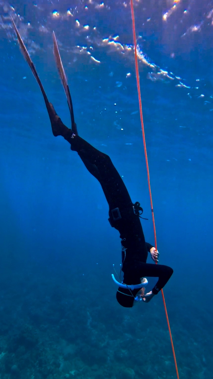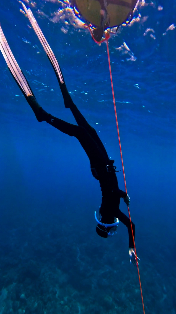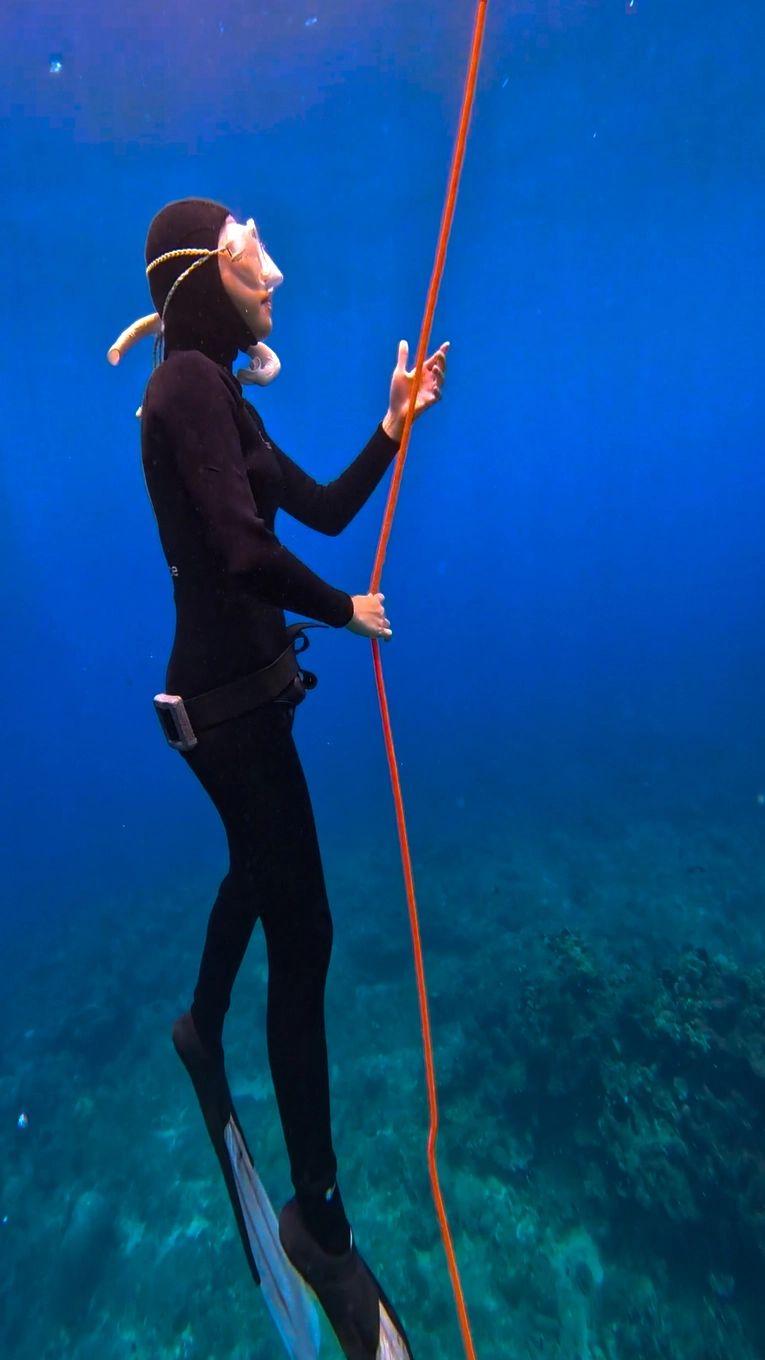 ▼直到抵達繩索底部,再翻身往上,浮出水面換氣。