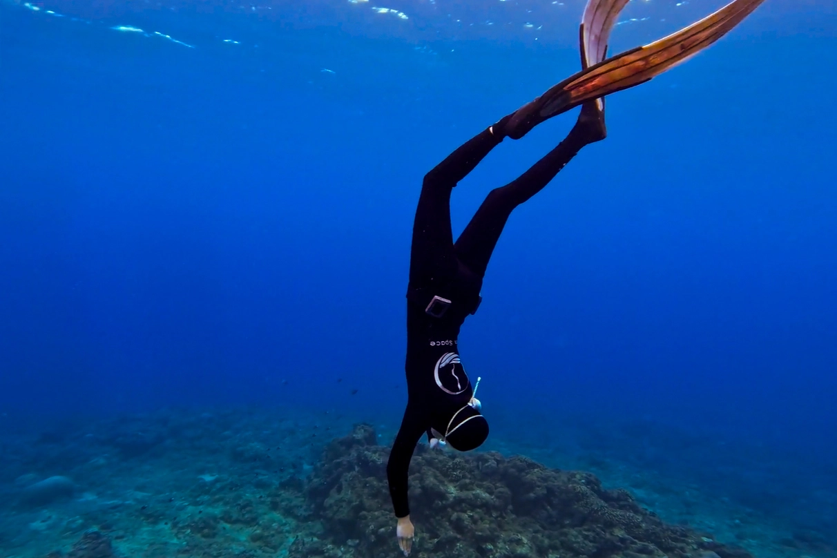 ▼接著是躬身下潛,這個動作學員需要先將身體躬身,再倒立入水,等到腳入水後一路踢水到海底,同時也要記得做好平壓。