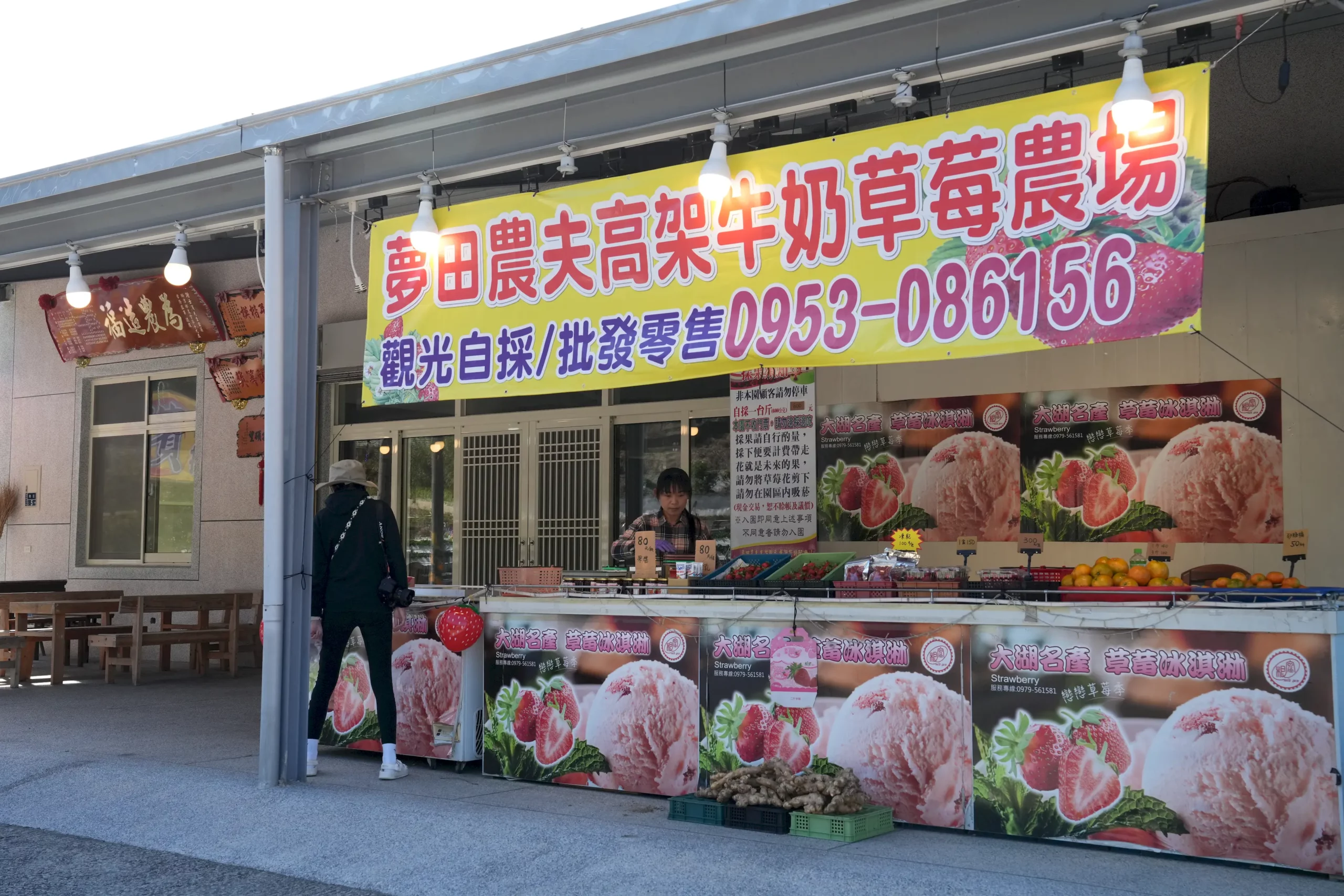 這裡最大的特色是使用「牛奶酵素」來灌溉草莓,果實特別香醇,園區裡面還有大型複合賣場,可以買到草莓周邊商品、輕食點心、各種飲料,還有休息空間跟座位區。