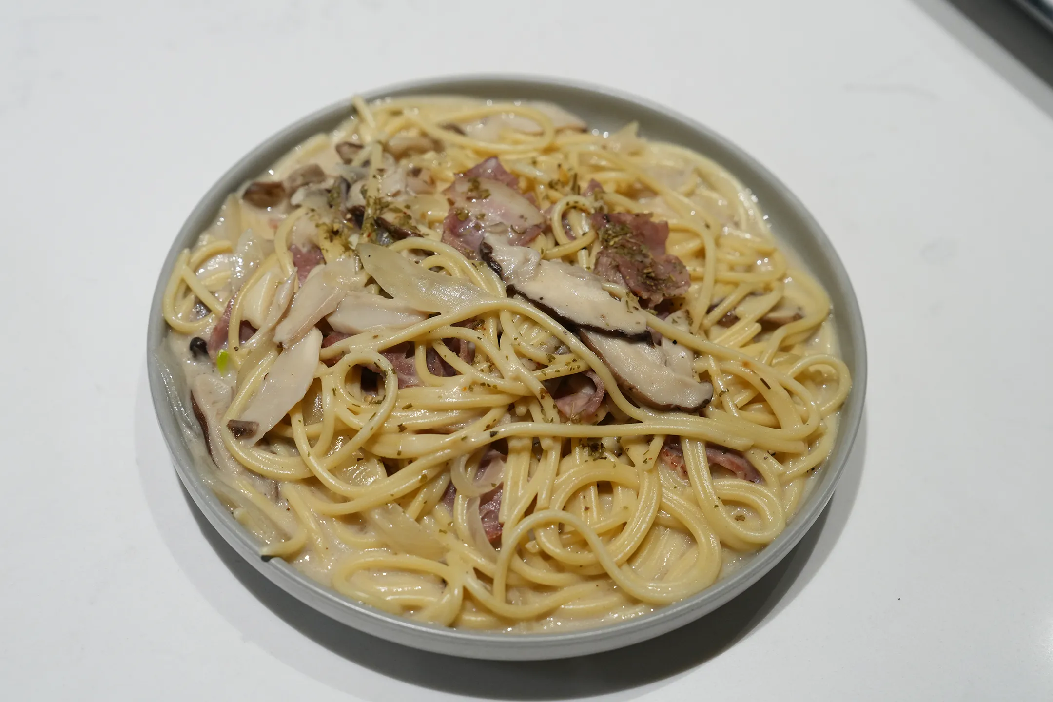▼除了以上需要自行烹煮的餐點外,工作人員還端了一盤奶油培根義大利麵,送來的時候還很熱,熱熱的吃味道很不錯,但對我來說,調味還是稍鹹一點。