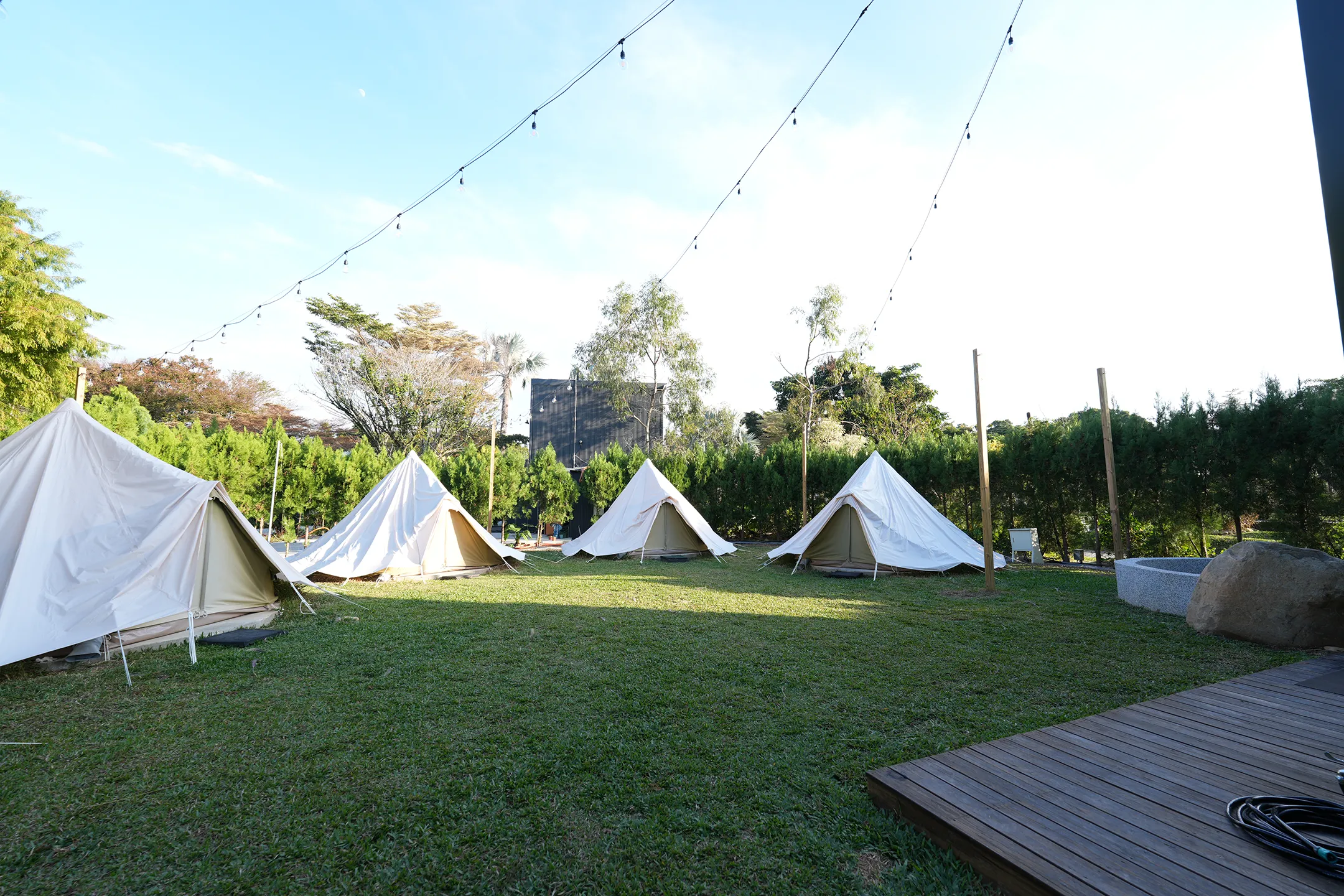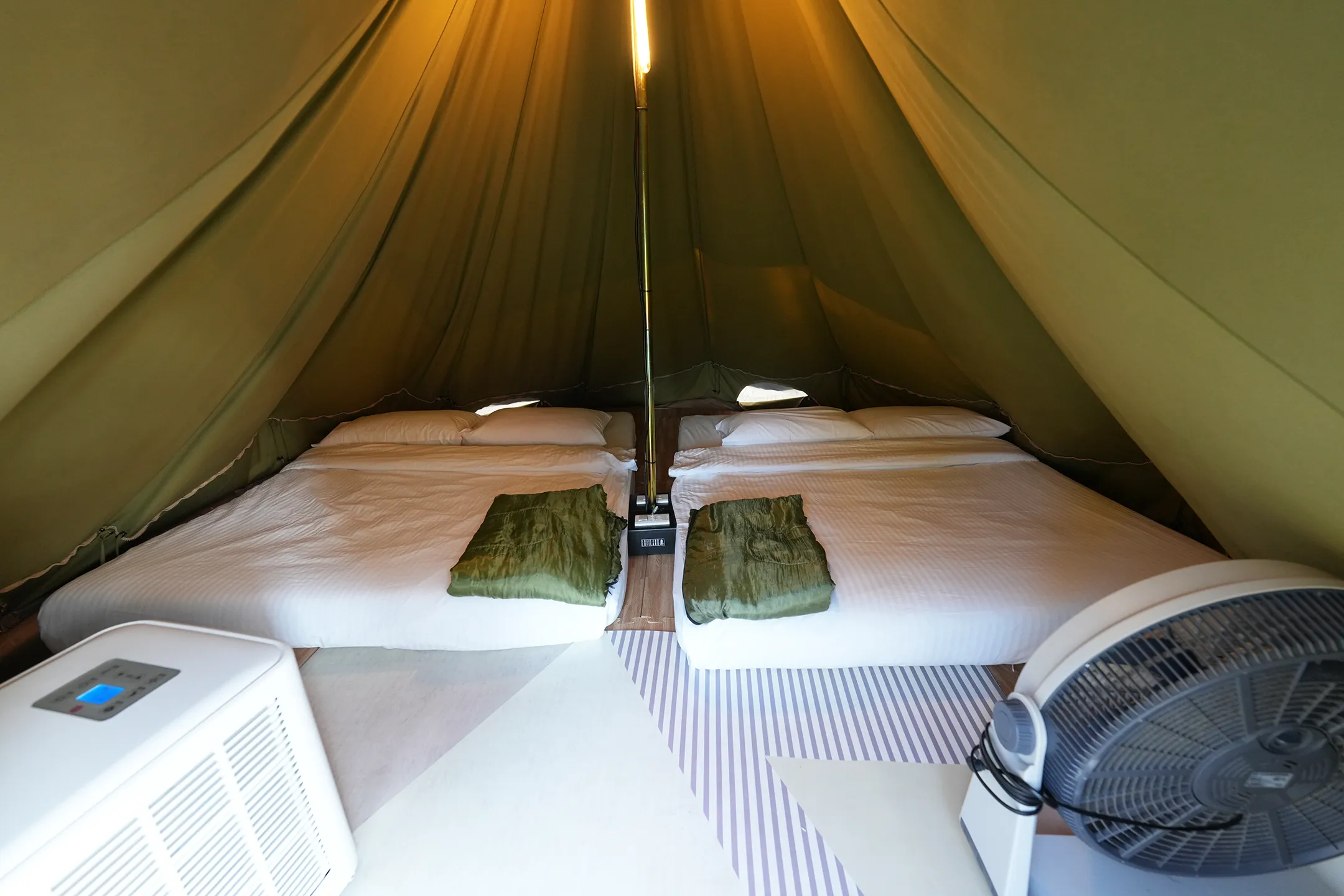 ▼放眼望去,好幾個米白色帳篷整齊地圍繞成一圈,形成一個充滿氛圍的露營聚落。每個帳篷內部空間寬敞,配置了兩張舒適的雙人床,最多可以容納4人同時入住,非常適合家庭或多人團體。而我跟朋友只有兩人,卻能獨享整個區域,空間顯得格外寬敞。