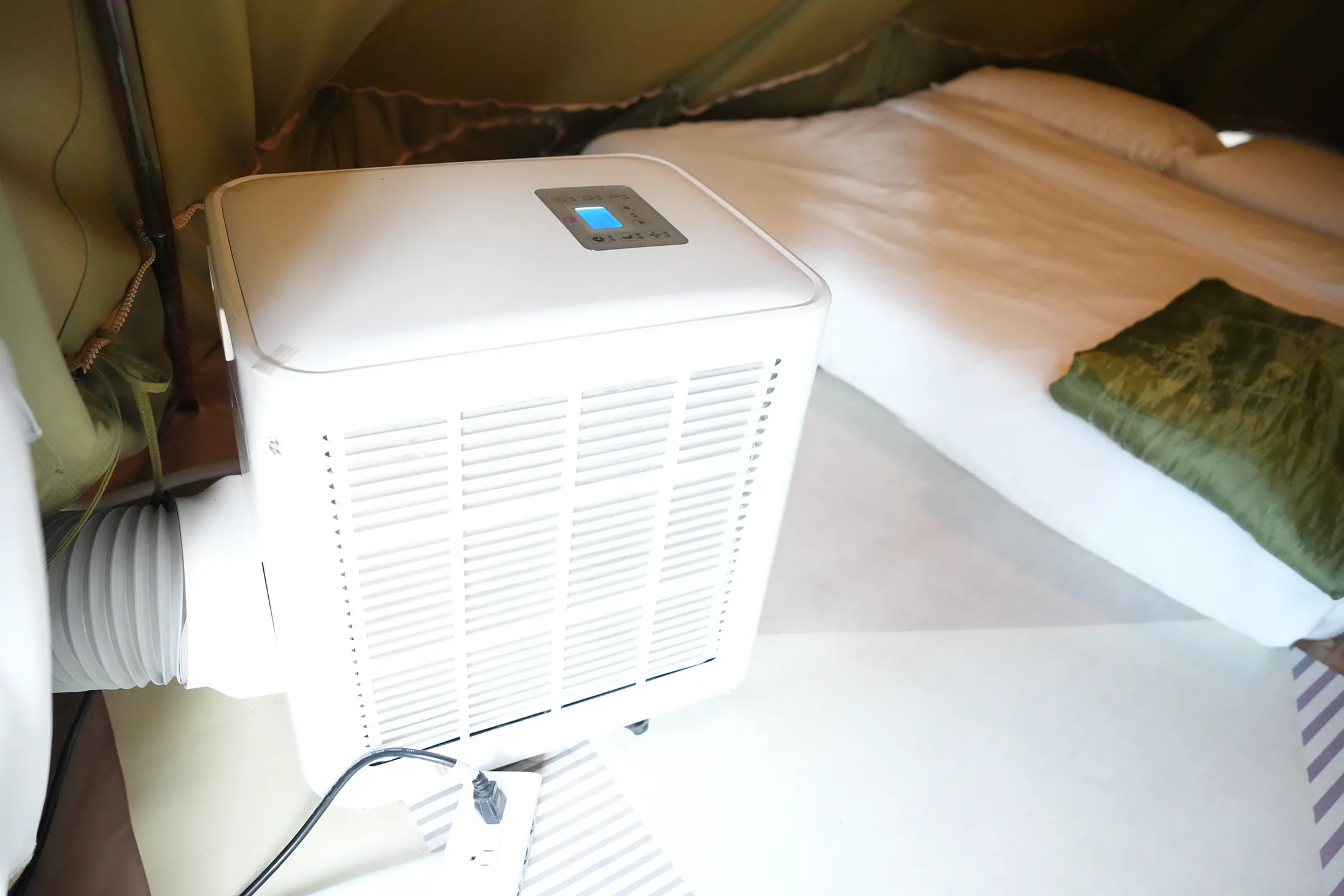 ▼移動式冷氣絕對是夏天來訪的救星。炎炎夏日在戶外活動一整天後,回到帳篷內若沒有空調會相當悶熱難耐。幸好每個帳篷都配備了移動式冷氣機,開啟後能迅速降溫,將帳篷內調節到舒適宜人的溫度。