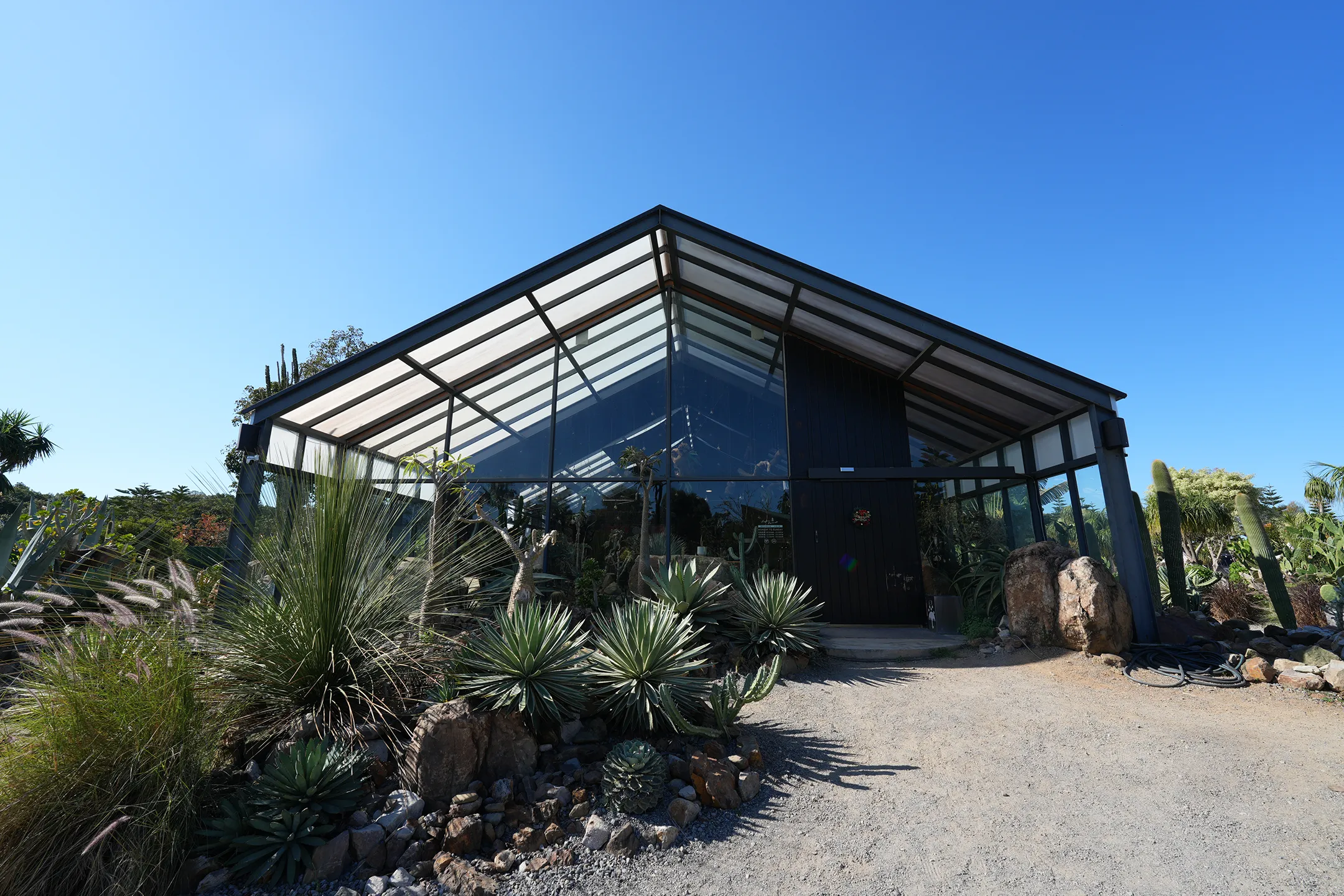 ▼這座玻璃建築在陽光照射下顯得格外通透明亮,室內空間寬敞舒適,擺設著綠色植栽,營造出清新自然的氛圍。周圍種滿了各式仙人掌,看過去就很有沙漠氣息。