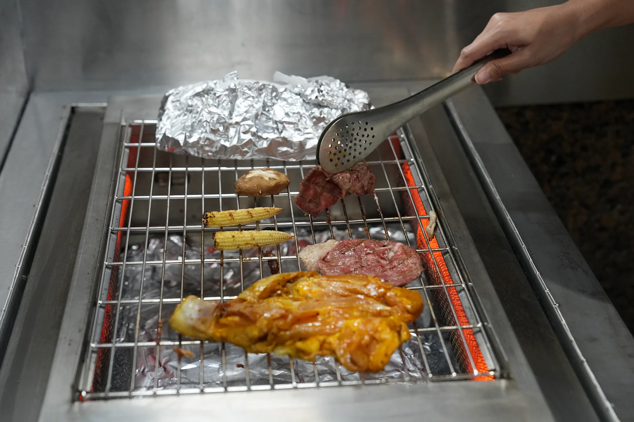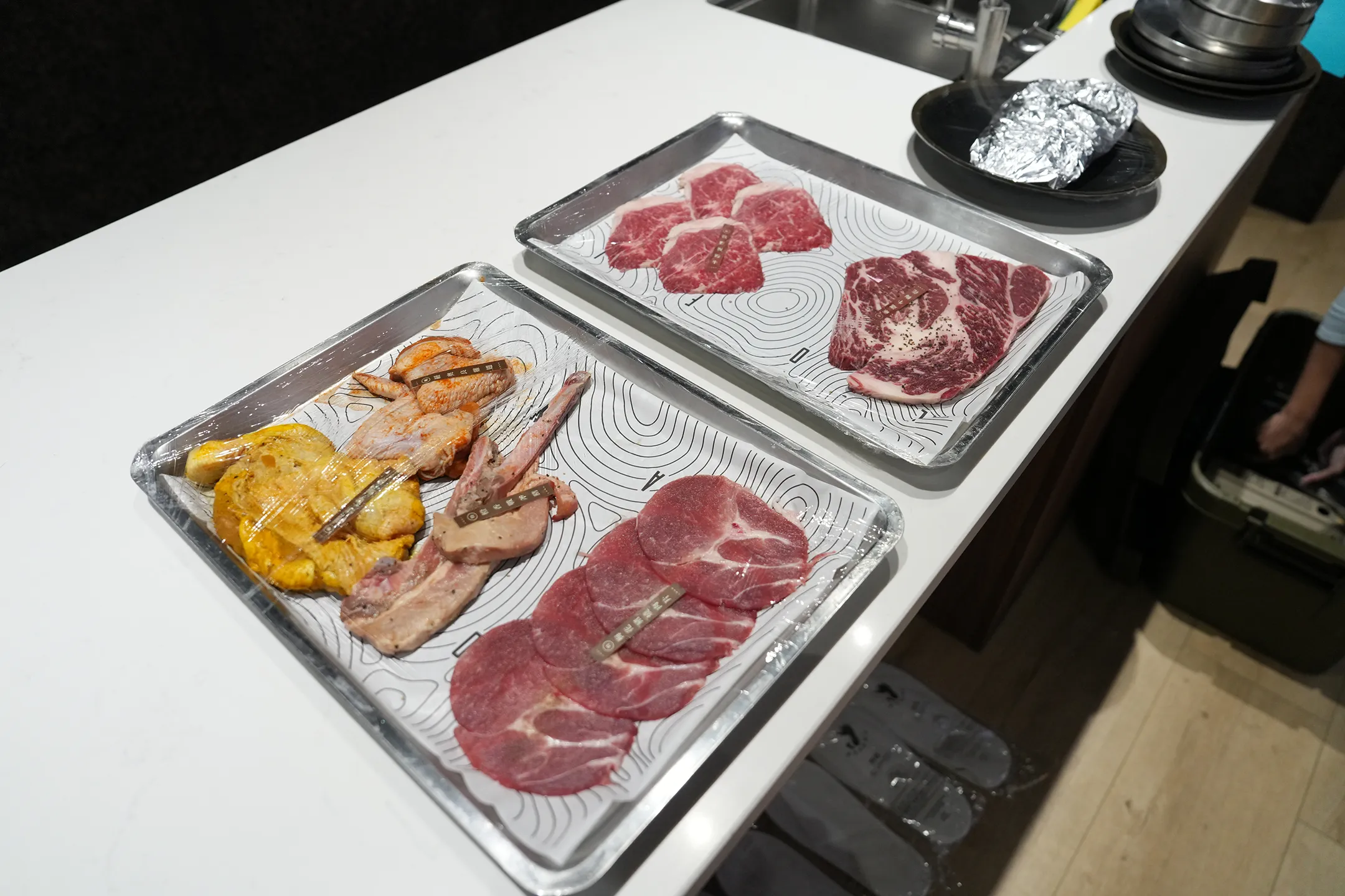 ▼每一種肉品都有清楚標示種類跟風味特色,讓我們能依照喜好挑選適合的食材。特別的是,旁邊還有用鋁箔紙仔細包裹起來的新鮮鱸魚,這樣的包裝不僅能保持魚肉的鮮度和水分,也方便直接放上烤爐進行烘烤。從肉品到海鮮,食材種類豐富多樣,讓晚餐的菜色更加豐盛精彩。