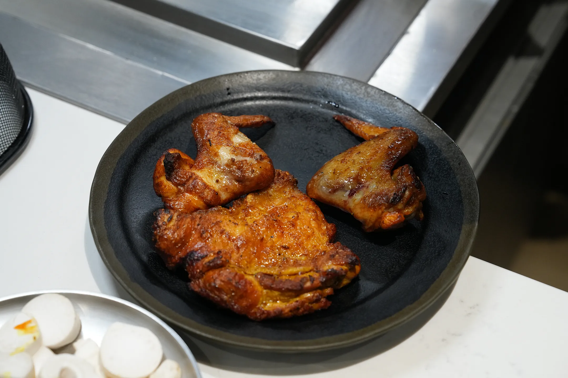 ▼烤好的雞肉外皮呈現漂亮的金黃焦香色澤,看起來非常誘人可口。肉汁在高溫烘烤下被鎖在肉質裡,切開時還能看見透亮的油光,散發出陣陣炭烤香氣,迫不及待想要品嚐這親手烤出來的美味成果。