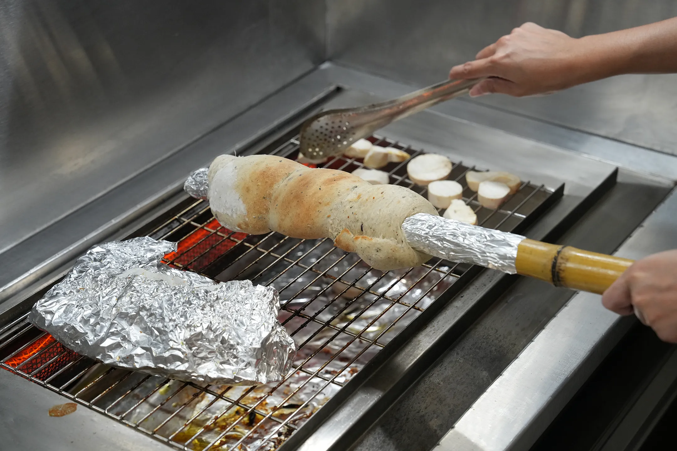 ▼別忘了我們下午辛苦製作的麵包,烘烤的方式是拿著竹子懸空在爐子上均勻烘烤,不能距離烤爐太近,所以燒烤的過程,手要持續拿著久了手會很酸。將纏繞著麵團的竹筒架在烤爐上,不時轉動讓各個角度都能受熱均勻,麵團逐漸膨脹變大,表面慢慢轉為金黃色澤。隨著烘烤時間拉長,空氣中會慢慢飄散出麵包特有的香氣。