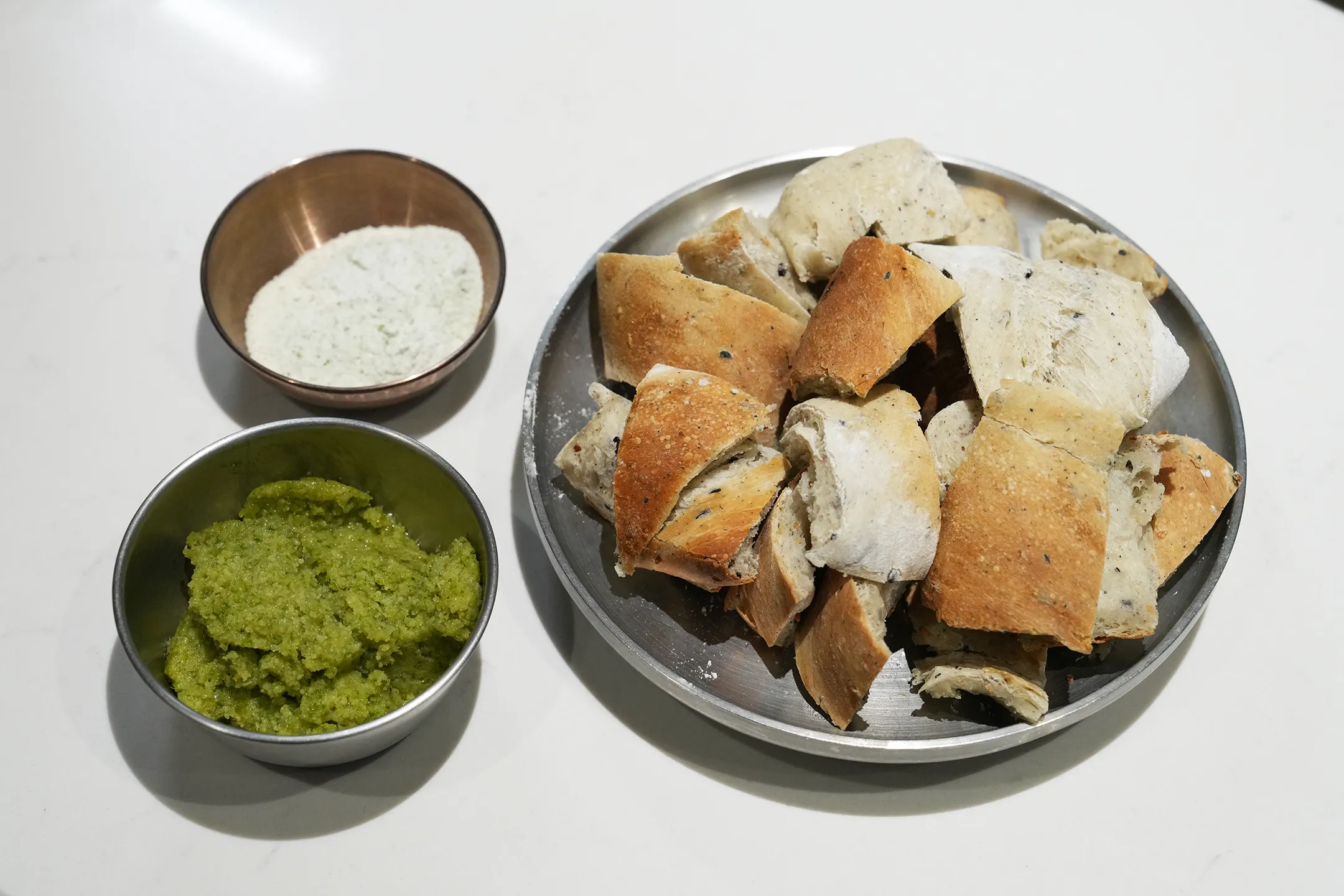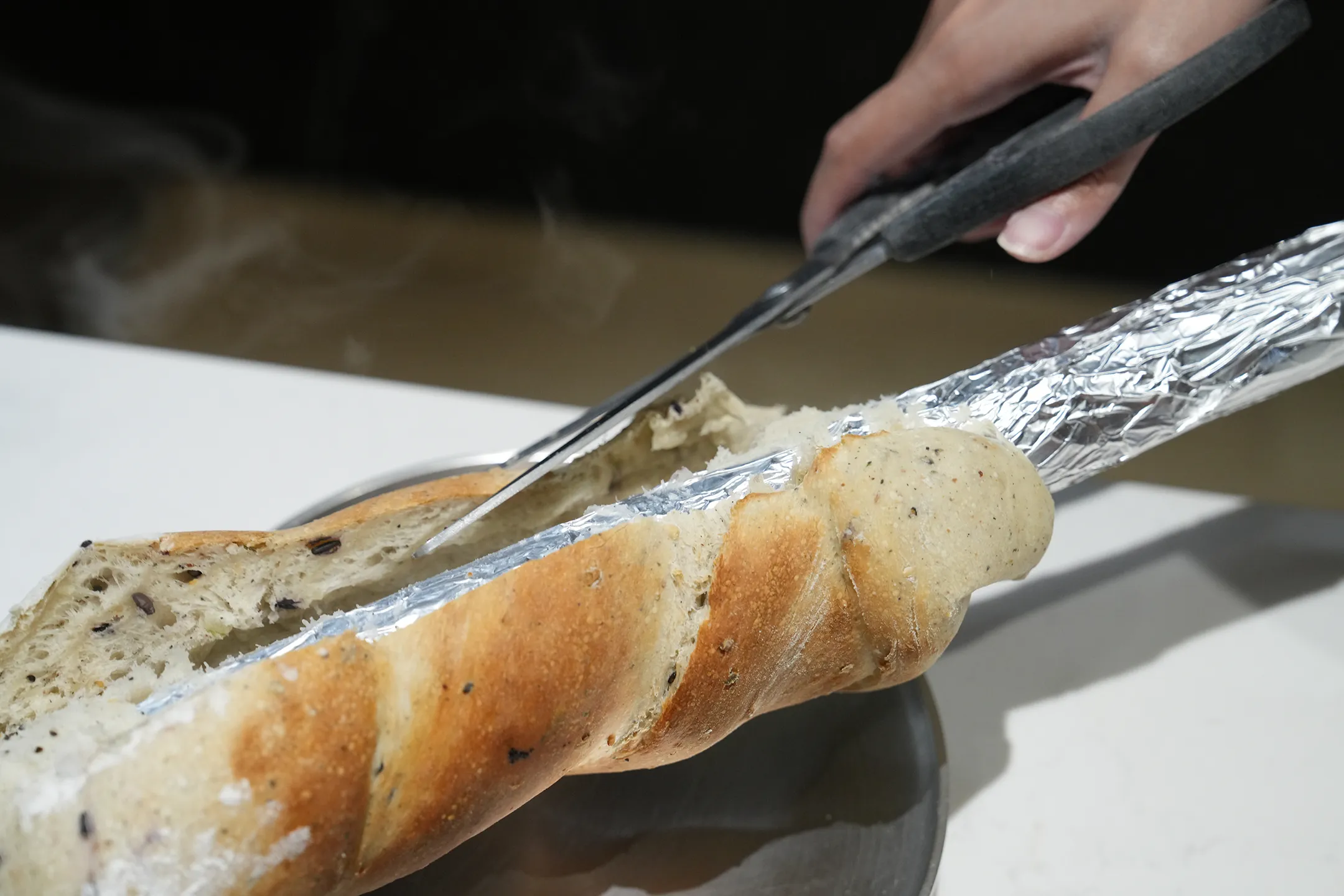 ▼剪開麵包後,撲鼻而來的是濃郁香醇的麵粉香氣,混合著烘烤後的焦香味,讓人食慾大開。麵包內層鬆軟綿密,外層帶著微微的焦脆口感,可以搭配我們下午親手製作的香草佐料,或是園區提供的另一種醬料一起享用。咬下一口,鬆軟的麵包在口中散開,佐料的香氣與麵包完美融合,讓人忍不住一口接一口,也是當天所有餐點中我們最喜歡的餐點,真的非常令人印象深刻。