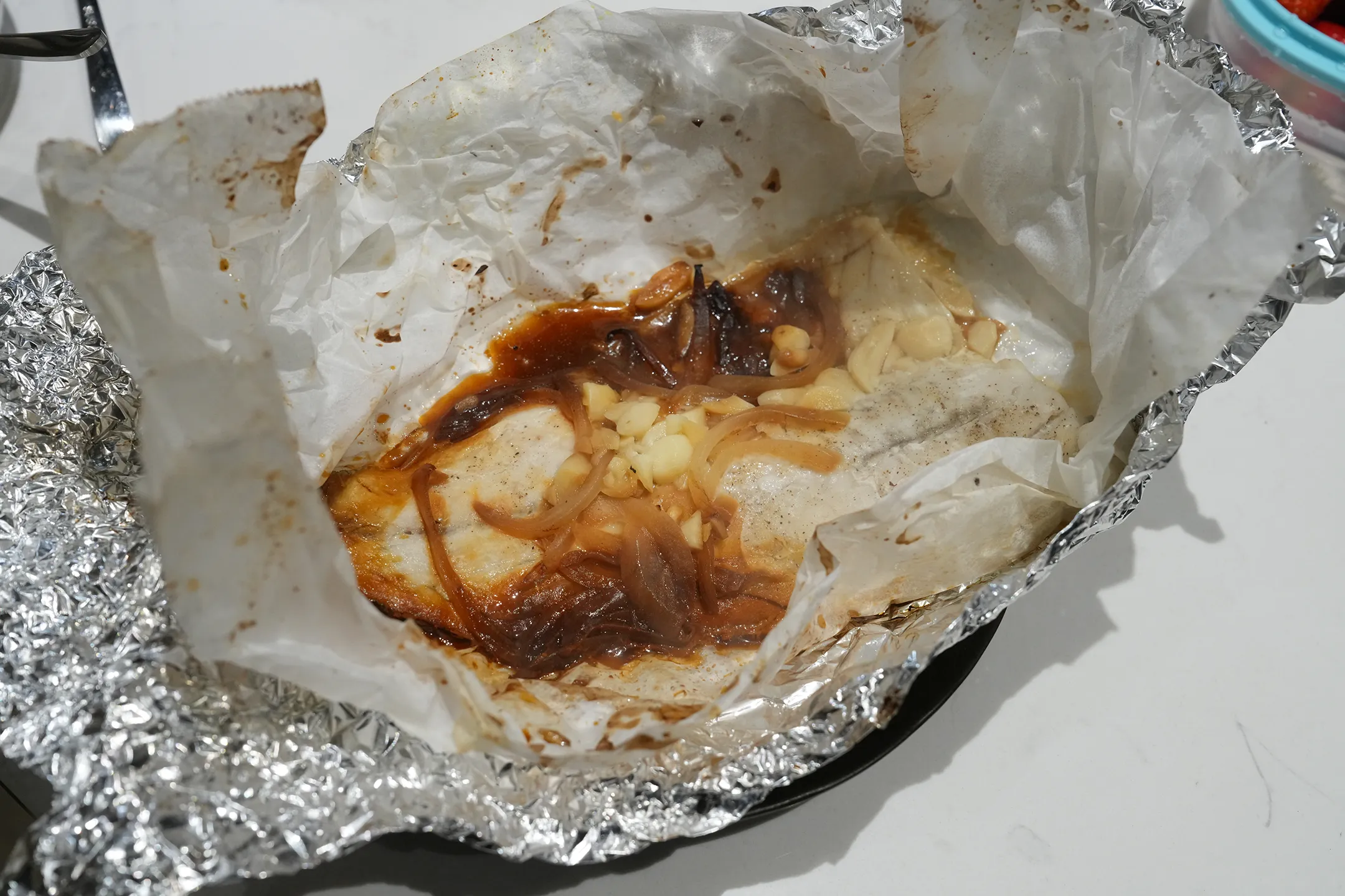 ▼烘烤好的鱸魚從鋁箔紙中取出,熱氣蒸騰,散發出迷人的香氣。魚肉在炭火的烘烤下呈現漂亮的乳白色,肉質細緻軟嫩,用筷子輕輕一撥就能分離。鱸魚本身肉質鮮甜,經過烘烤後更加香氣濃郁,入口即化的口感讓人驚艷。