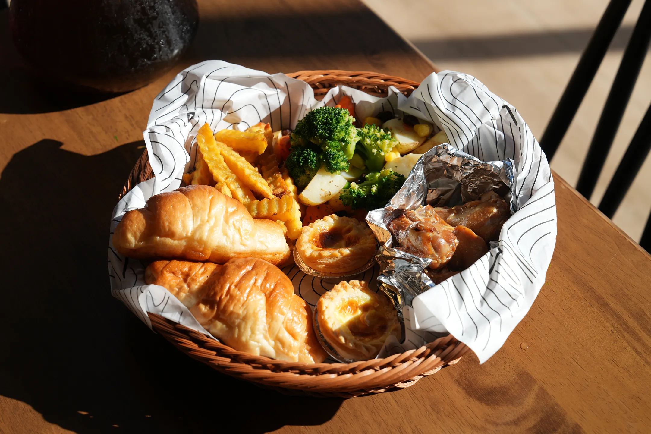 ▼早上起床後,我們來到客廳就看到早餐已經放在餐桌上,早餐內容物包括:麵包、蛋塔、時令蔬菜、薯條、雞肉,薯條吃起來偏乾,雞翅也因為冷掉而變得不太好吃,會讓我有點懷疑早餐是不是放很久了。