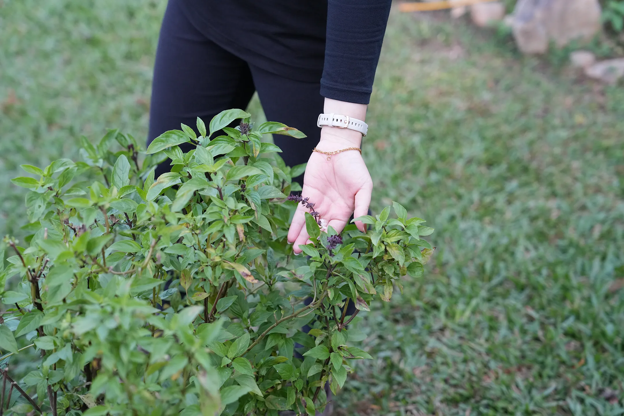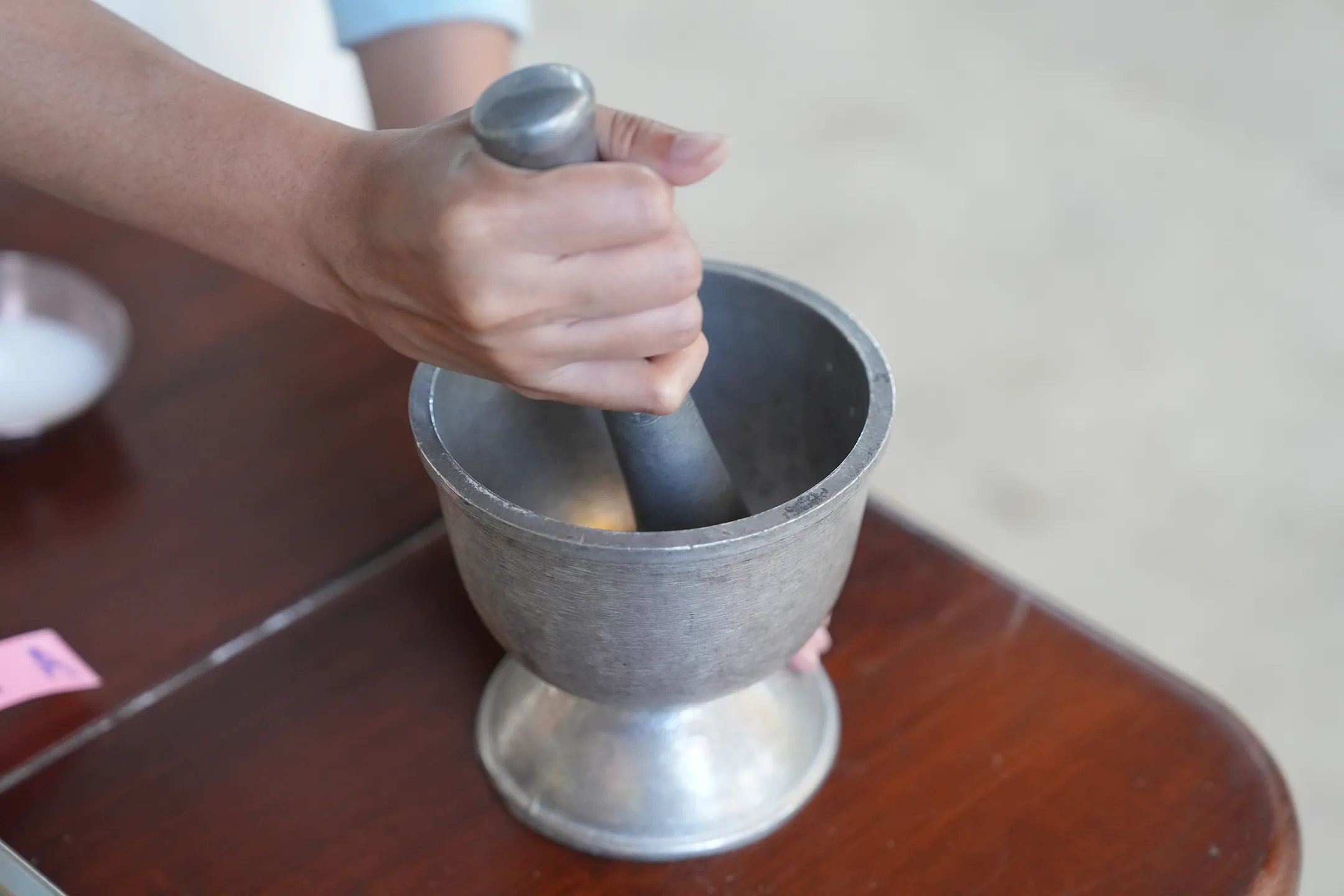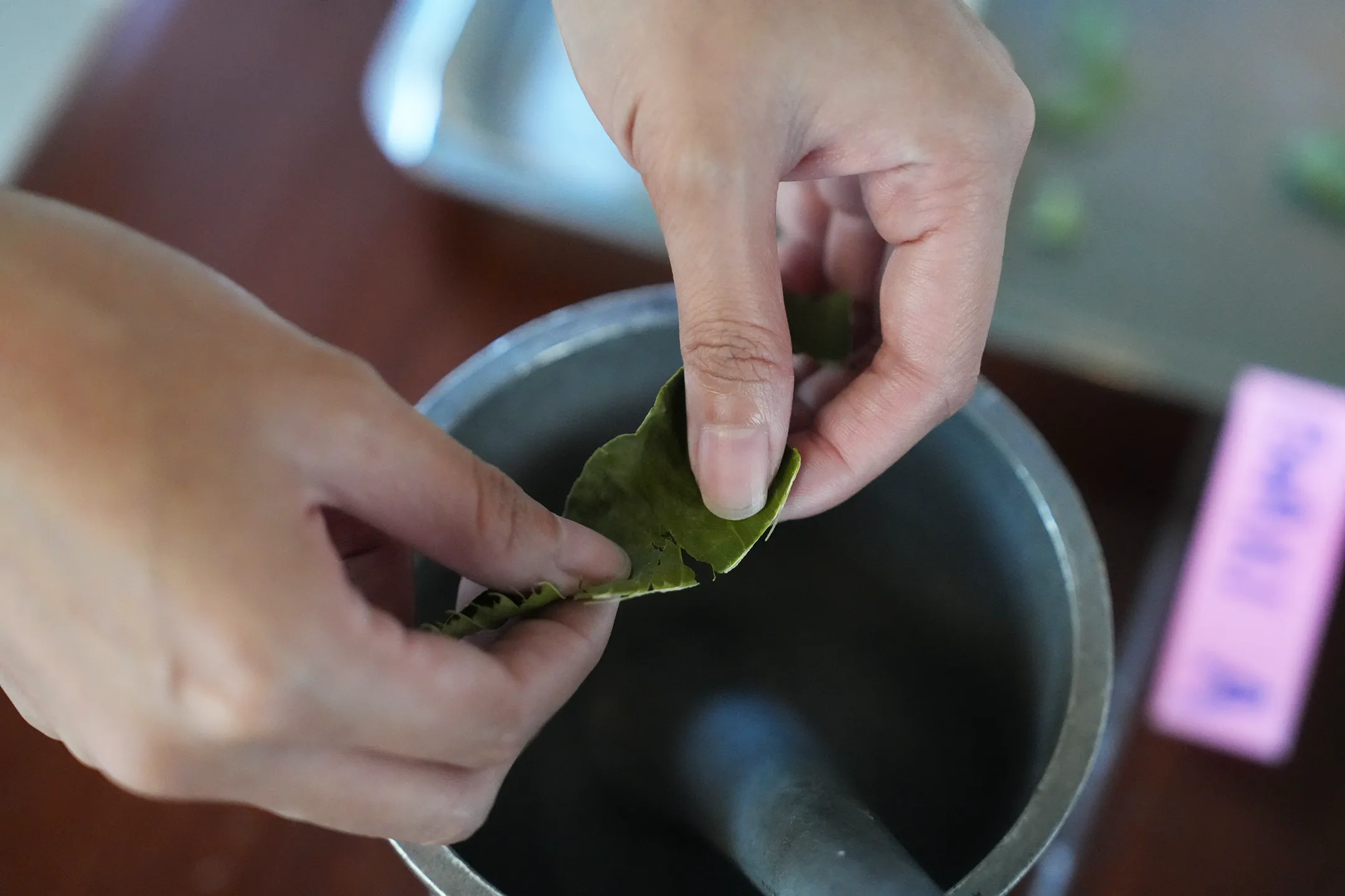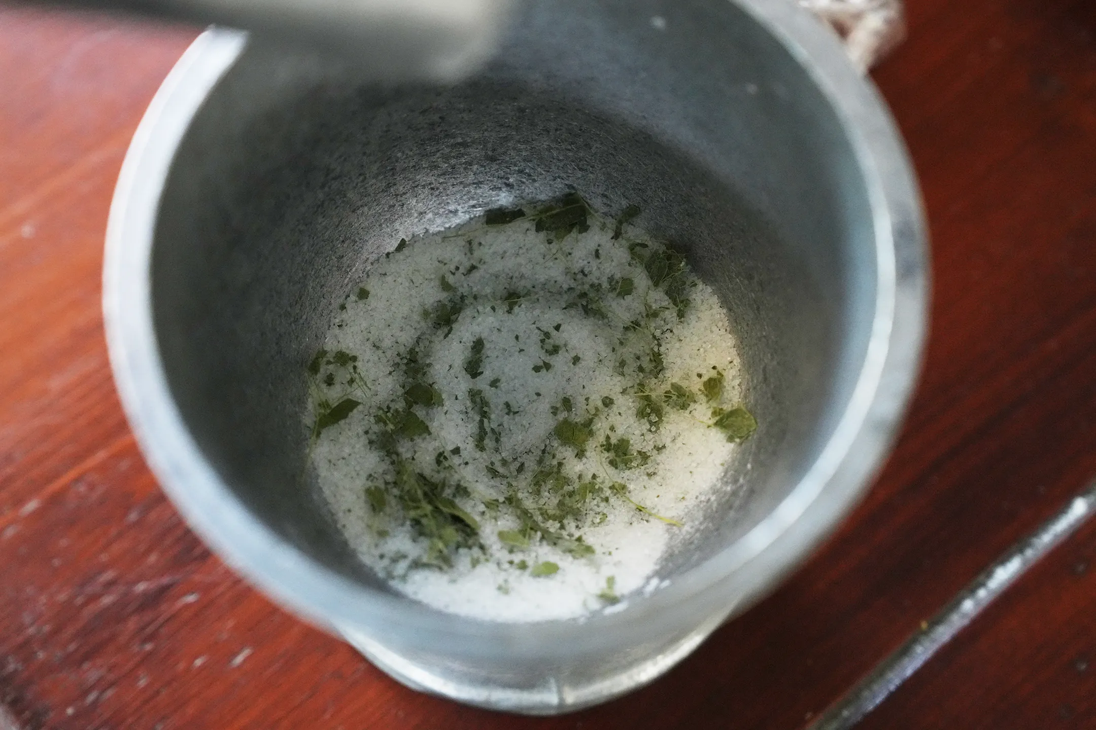 ▼首先要將帶有香味的新鮮葉子從鋁臼中取出,撕碎後再放回鋁臼中,接著拿起鋁杵用力搗碎,隨著搗擊的動作,葉片的清香逐漸釋放出來,空氣中瀰漫著淡淡的草本香氣。待葉子搗成細碎的泥狀後,再加入適量的海藻糖混合均勻,天然的甜味與香草氣息完美融合,就完成了我們獨特的手作佐料。