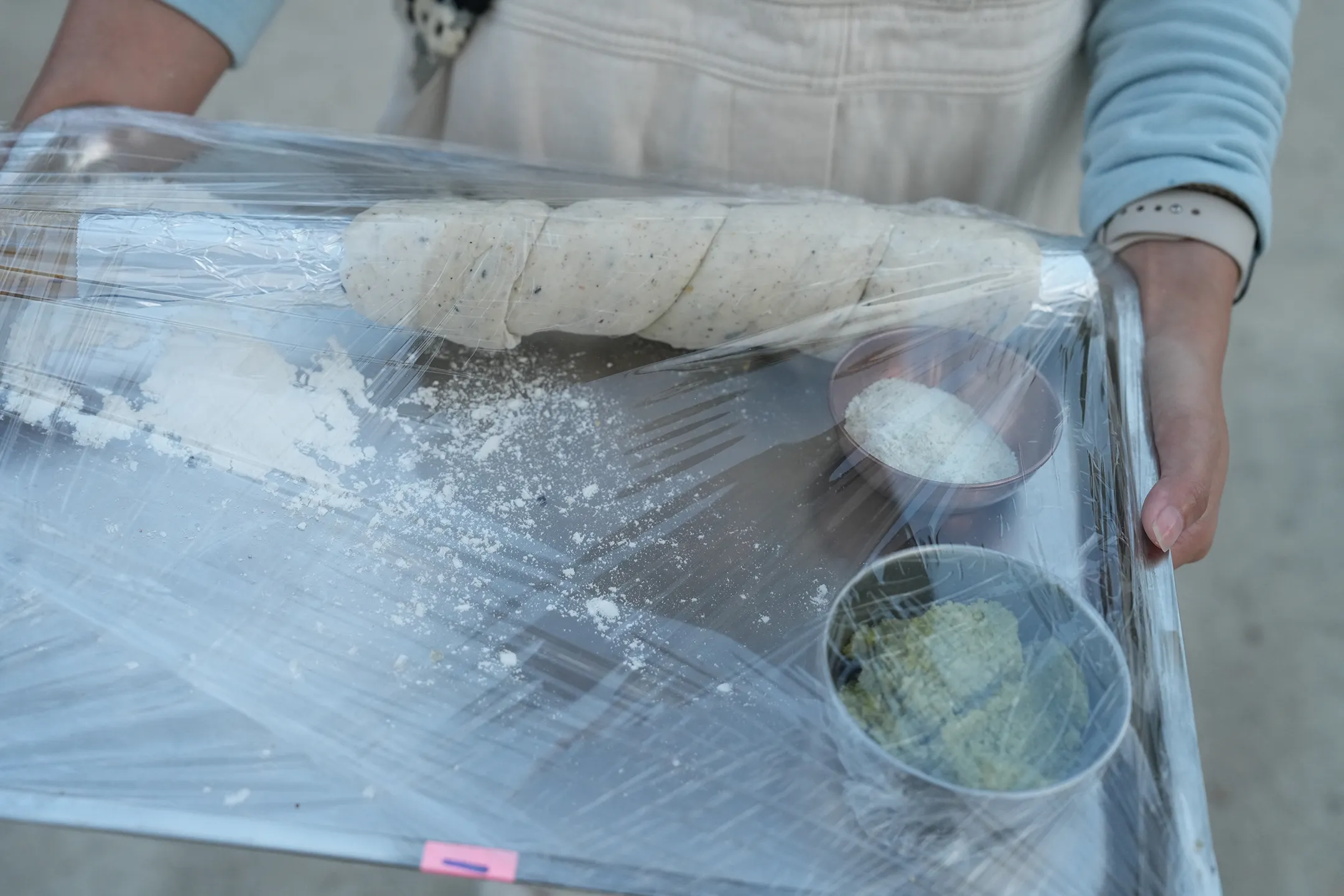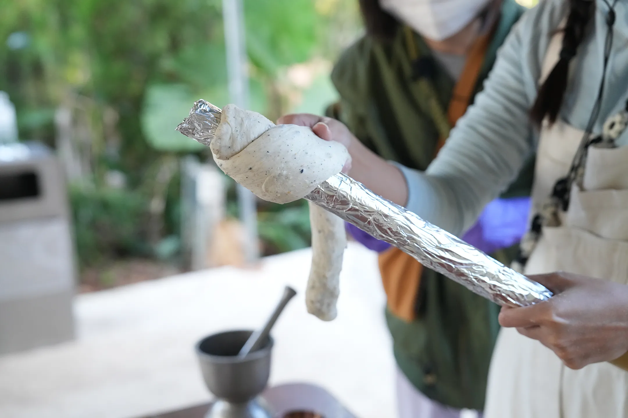 ▼第二項活動「做麵包」,桌上已經擺好了要做麵包的材料,麵團和旁邊的調味料都在意料之中,這些是製作麵包的基本配備。但最引人好奇的是桌上那根裹著錫箔紙的竹子,看起來既特別又神秘,完全無法從外觀判斷它的用途。