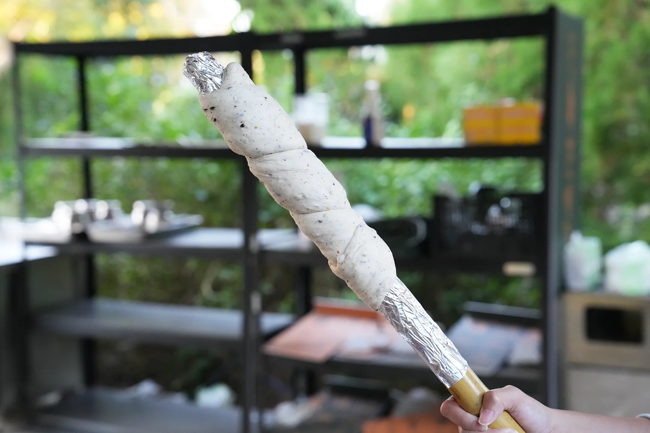 ▼接著,就把揉好的麵團小心地纏繞在裹著錫箔紙的竹子上。纏繞時要注意讓麵團均勻分布,厚度盡量一致,這樣烘烤時才能受熱均勻。隨著麵團一圈圈螺旋攀升,麵包的雛形逐漸成形。