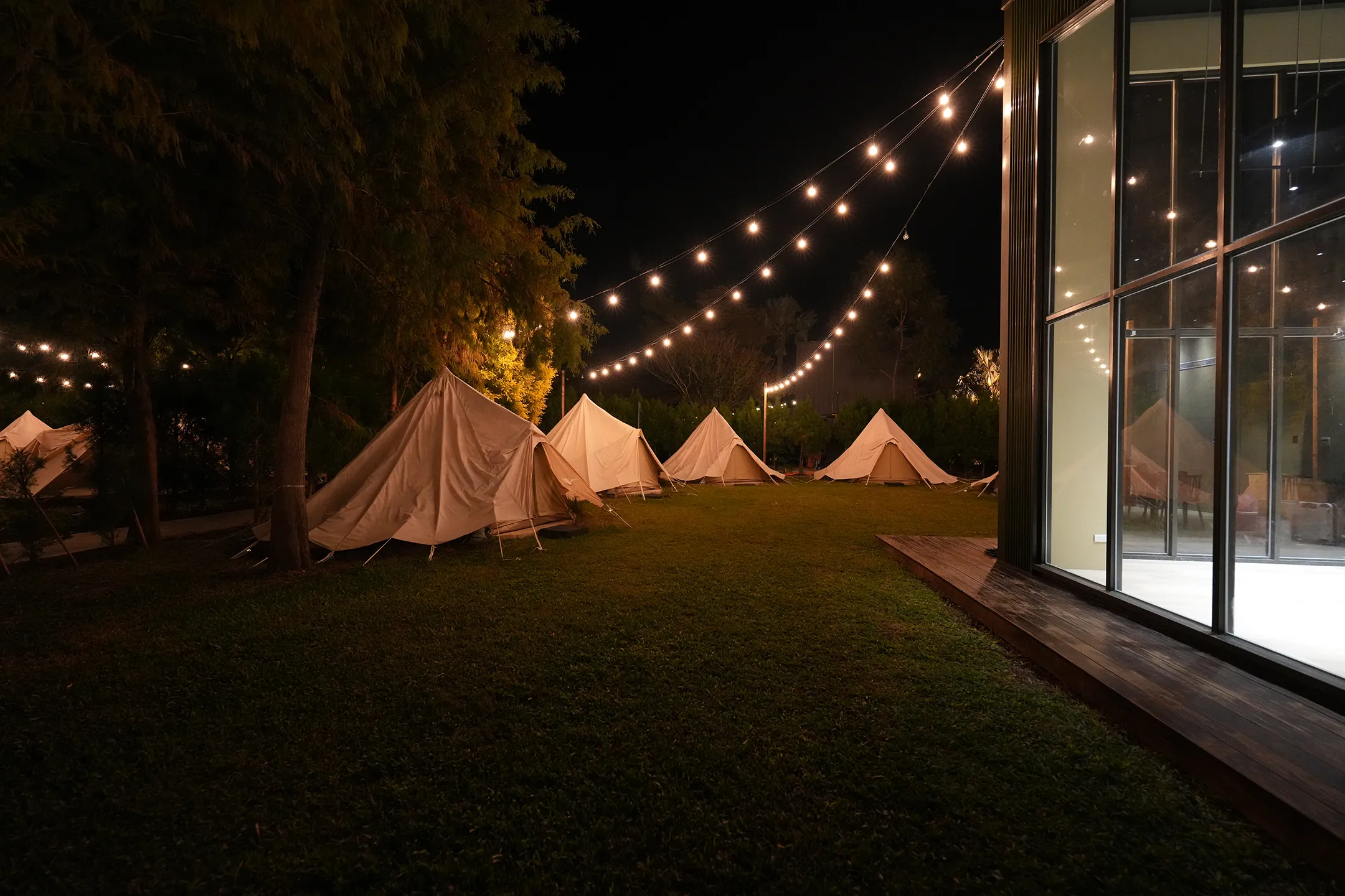 ▼入夜後點燈的帳篷區也是超級夢幻。當周圍的造景燈光點綴,整個營區瀰漫著寧靜浪漫的氛圍,與白天截然不同的景致讓人驚艷,忍不住拿起相機捕捉這美好的一刻。