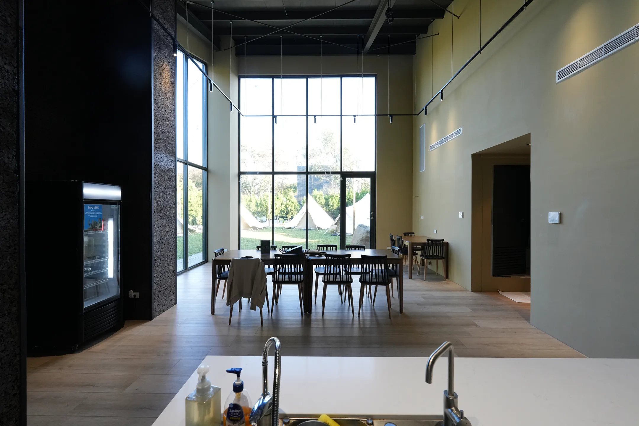 ▼室內空間非常寬敞,擺設著一張長型餐桌,坐在桌前就能透過窗戶望見外頭我們可愛的帳篷群。大面落地窗的設計讓白天的自然光線充足地灑入室內,整個空間顯得明亮通透,完全不需要開燈就能清楚看見周圍景色。