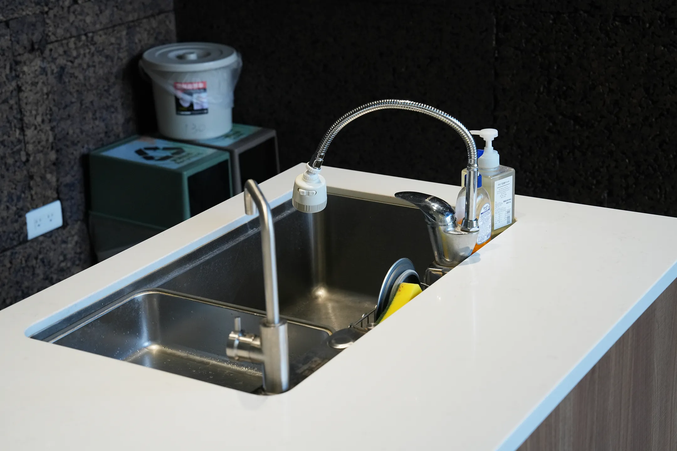 ▼流理臺、紅外線無煙燒烤爐、垃圾桶,設備配置就像一般家中廚房一樣完善。