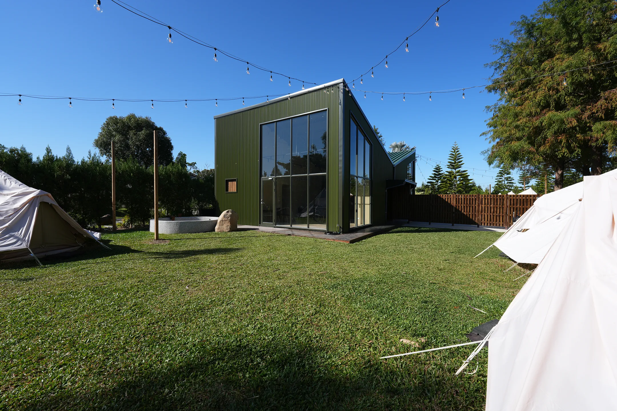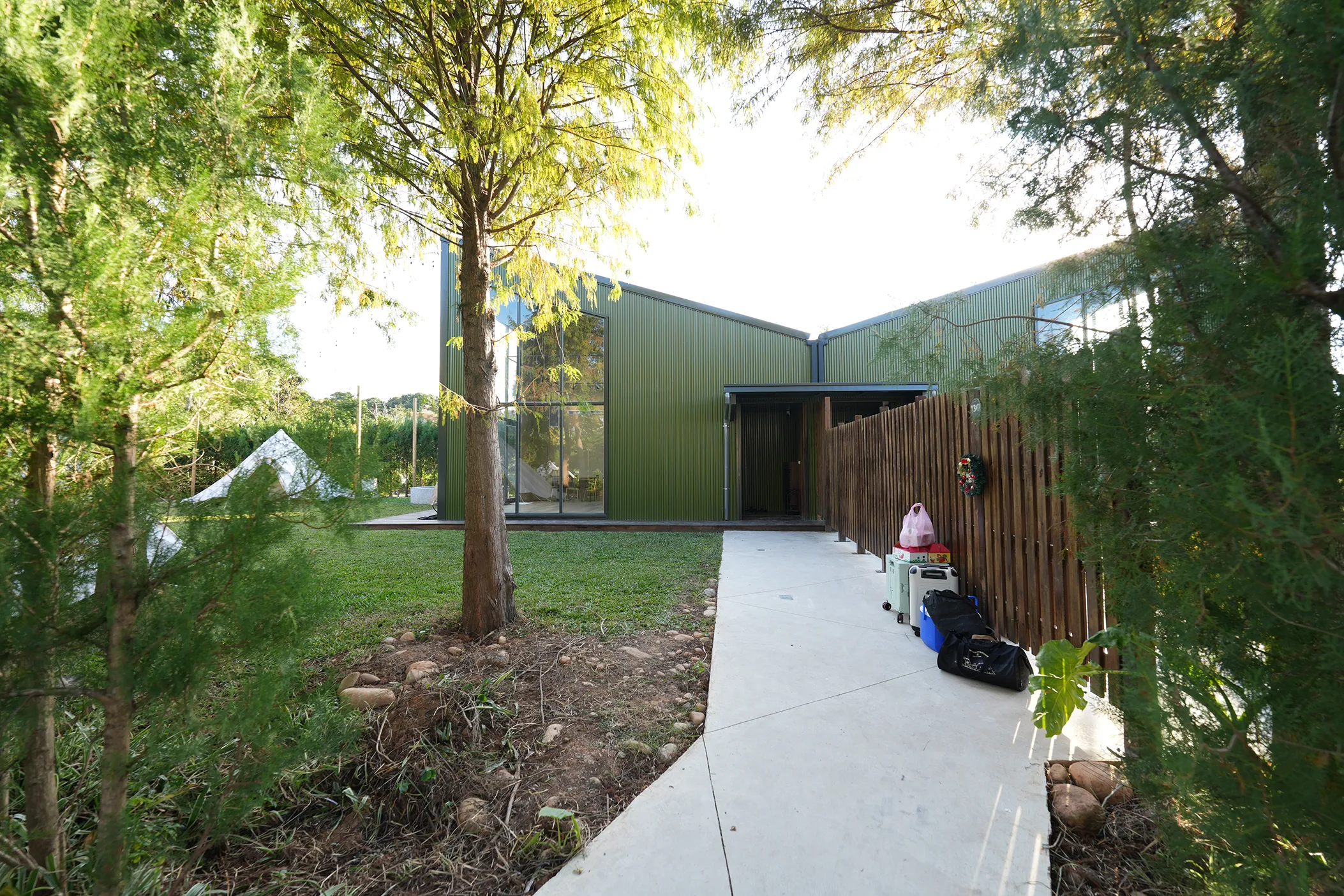 ▼我們入住的溫帶森林圈有一棟墨綠色建築,這是專屬於我們的公共空間。室內空間寬敞舒適,配備了完整的廚具設備,包括爐具、鍋碗瓢盆、調味料等應有盡有。晚餐時段我們就在這邊自行烹煮,這種半自助式的用餐方式增添了露營樂趣。