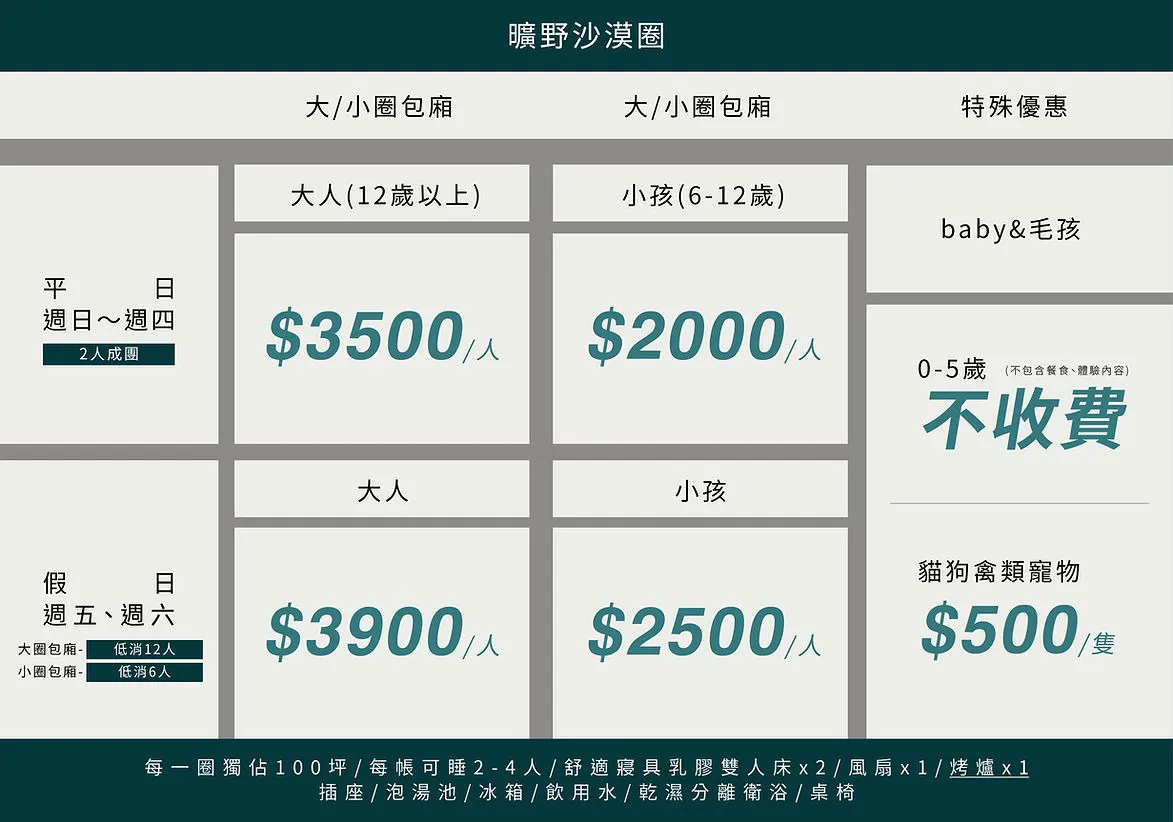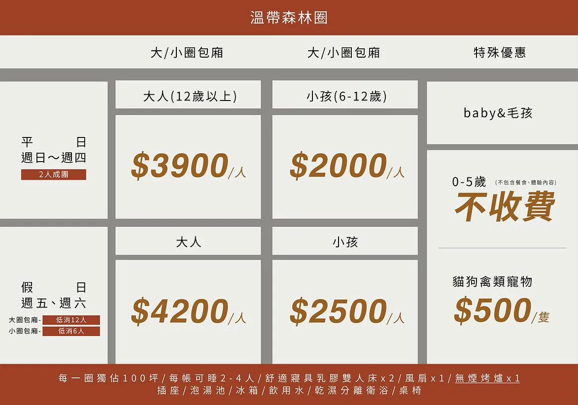 「自然圈農場」採包廂制,每一圈只招待一組客人,100坪的空間讓大家自由使用,週五、六有最低6人、12人的低消限制,平日(週一~四)則是只需要2人就可包圈。