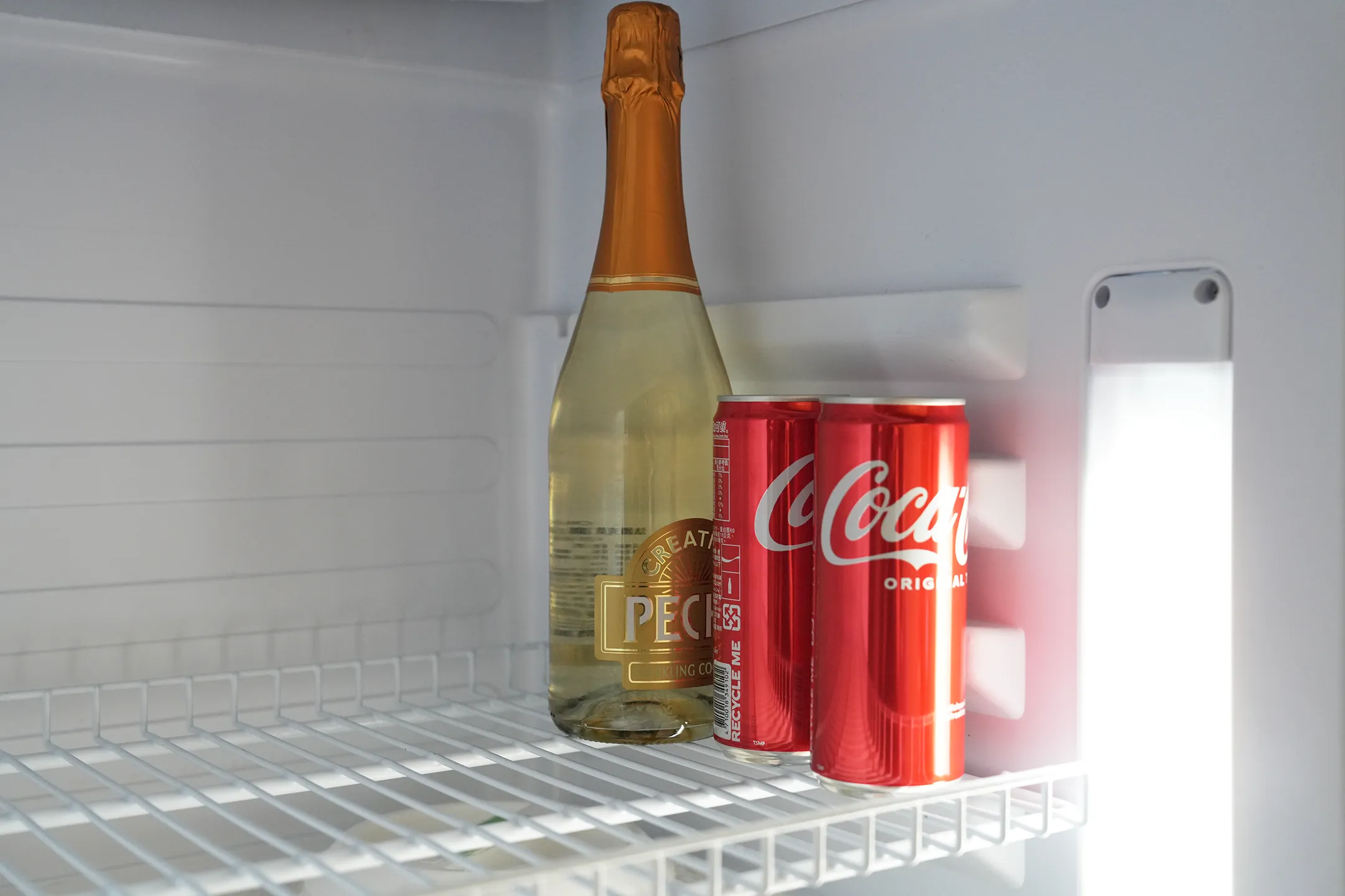 ▼冰箱裡還有兩罐可樂,還有一瓶法國克萊喜水蜜桃口味的氣泡酒,這是因為我們這個月有壽星,園區特別贈送的!