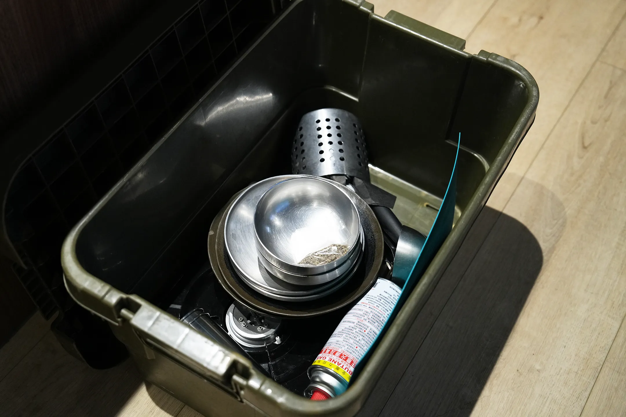 ▼烹飪工具則是放在塑膠箱裡,有:杯子、餐碗、餐盤、餐具、湯杓、烤肉夾等所有烹飪工具一應俱全,數量則是依照入住人數提供相對應的數量。
