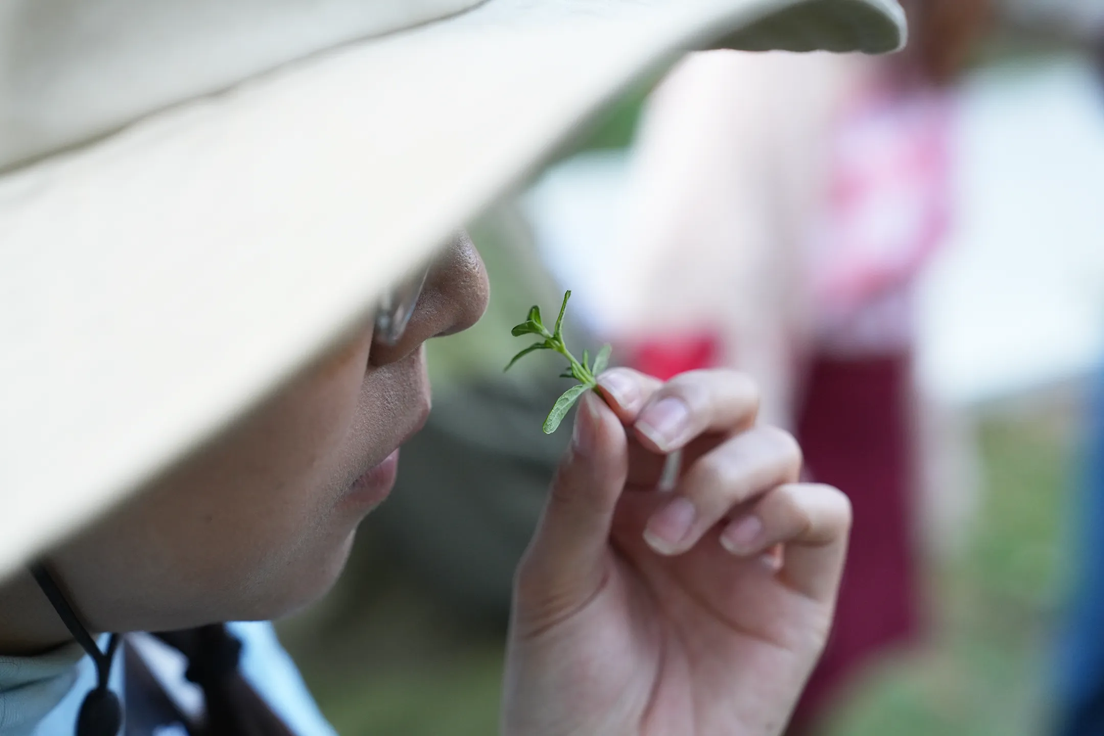 ▼第一項活動「認識香草」。導覽員會帶著我們走在蜿蜒的小路上,小路周邊有種植各式各樣的香草,導覽員會一邊走一邊跟我們介紹,還會隨手摘一些葉子讓大家湊近聞聞看,他還有教我們一個小技巧,把葉子輕輕搓一搓或壓一壓,香味會瞬間變得更濃郁