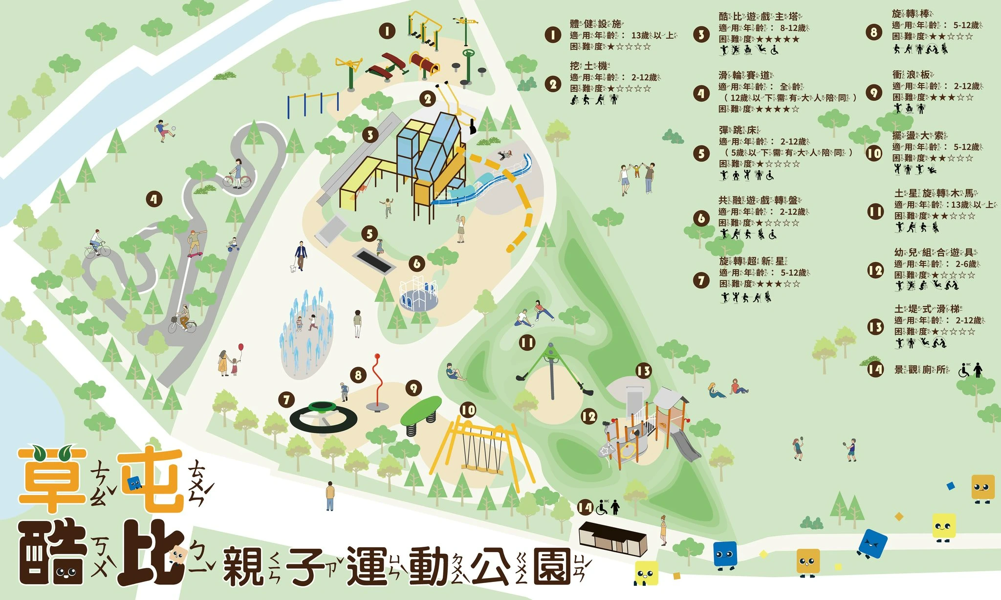 ▼「草屯酷比親子運動公園」共有13個遊樂設施,在公園地圖上都有明確標示適合的年齡以及用星星數表示困難度。