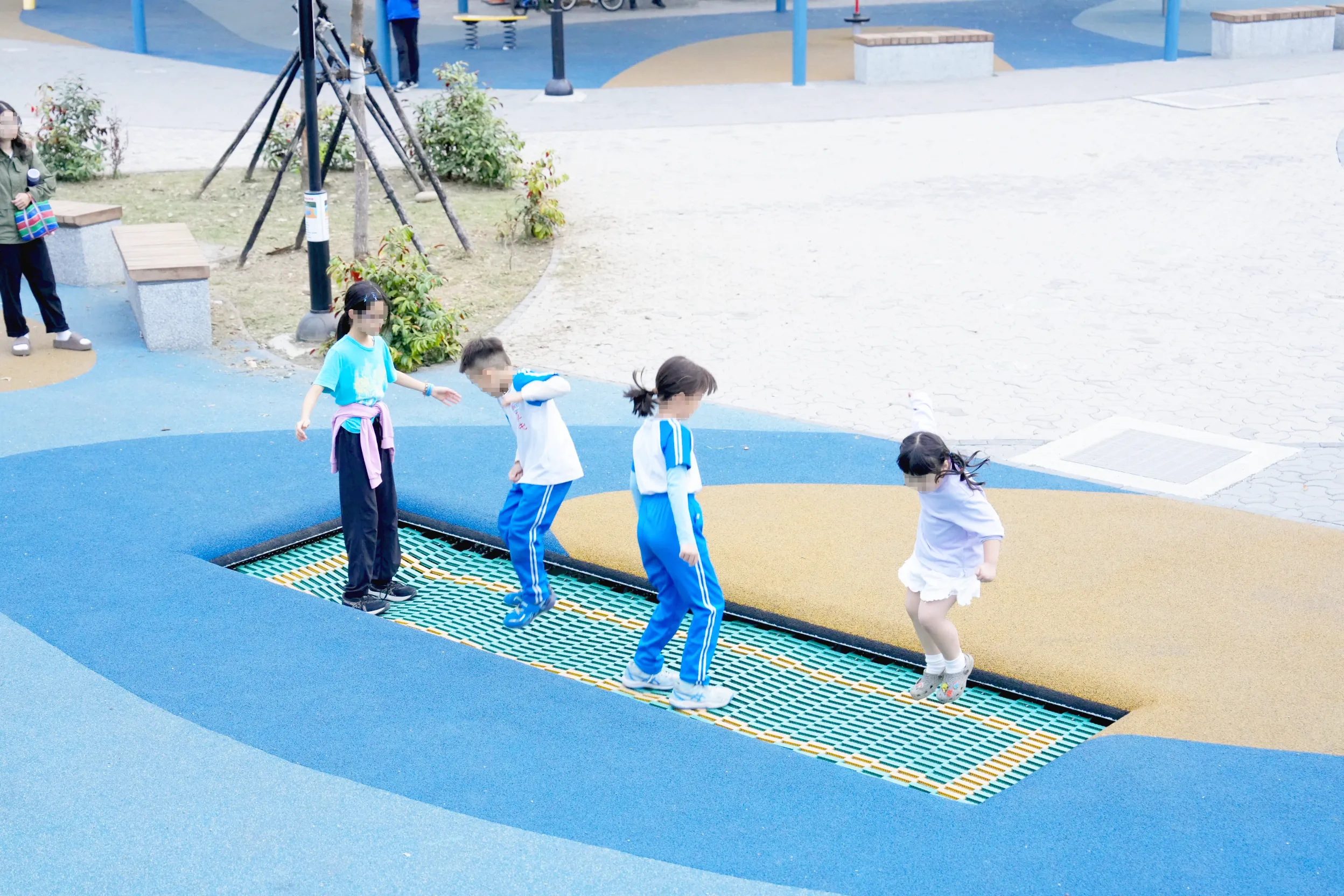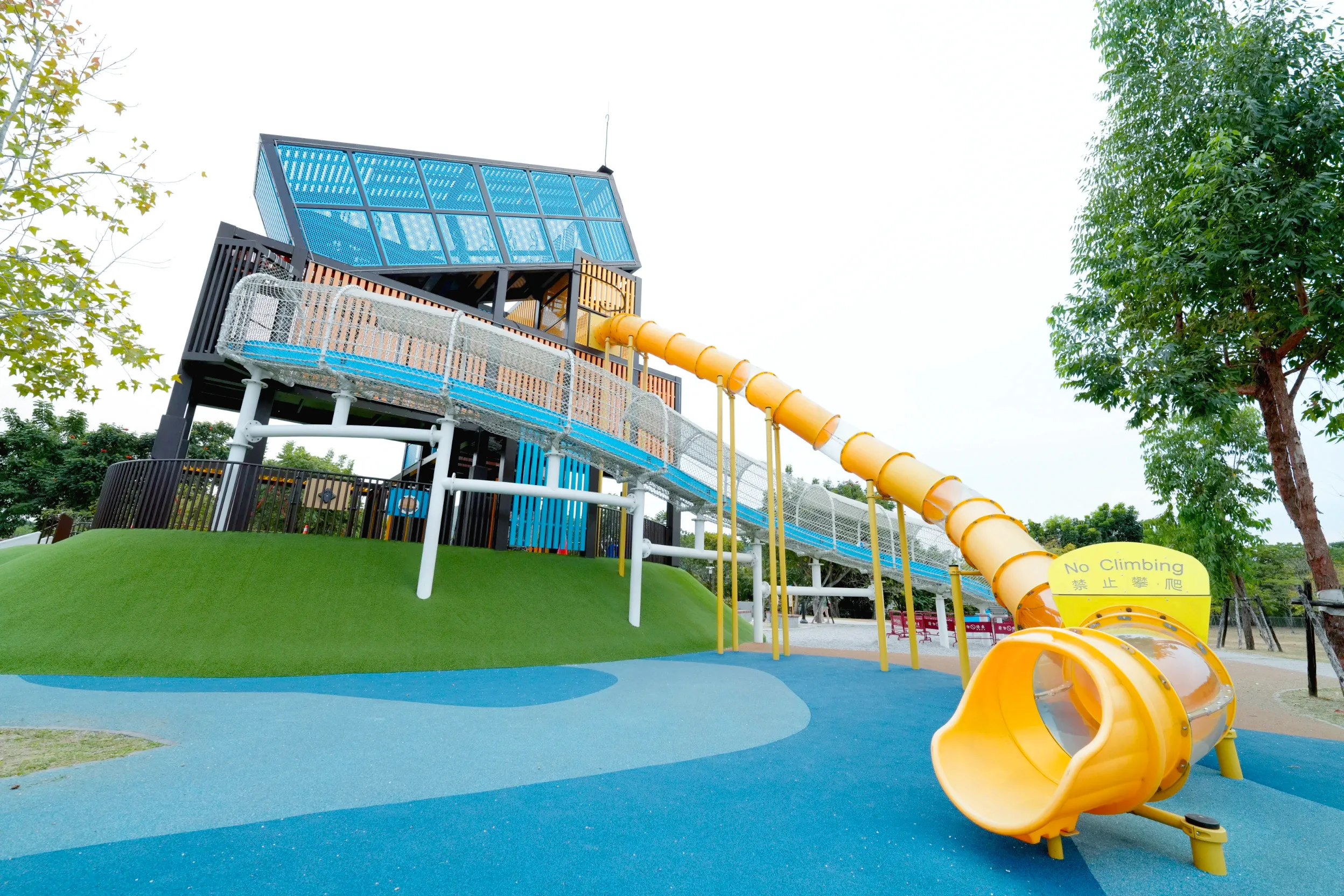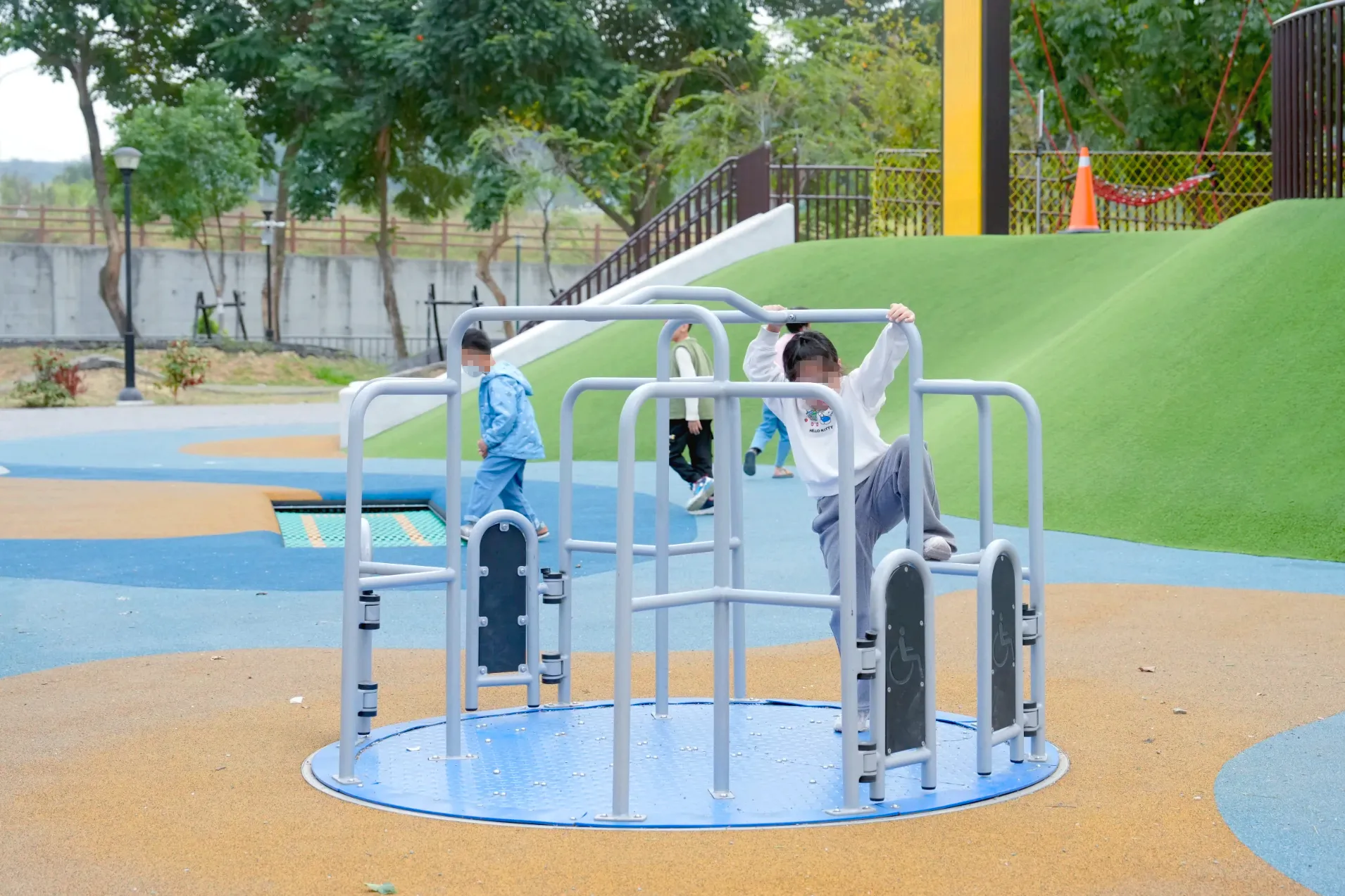 ▼主塔區的前方有彈跳床和共融遊戲轉盤這兩個設施,適用年齡皆為2~12歲,不過由於彈跳床比較危險一點,所以有特別標註5歲以下的小朋友需家長陪同。