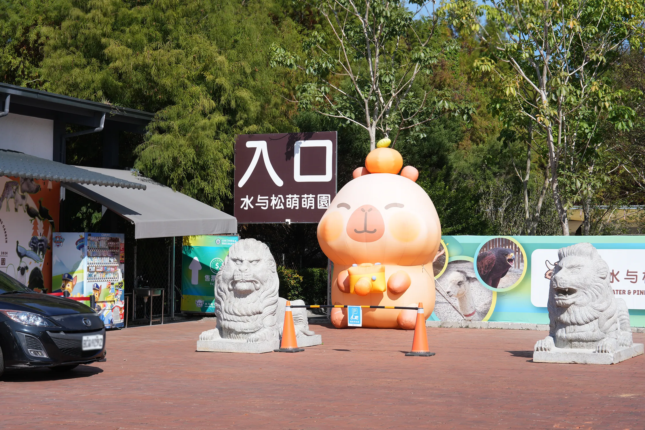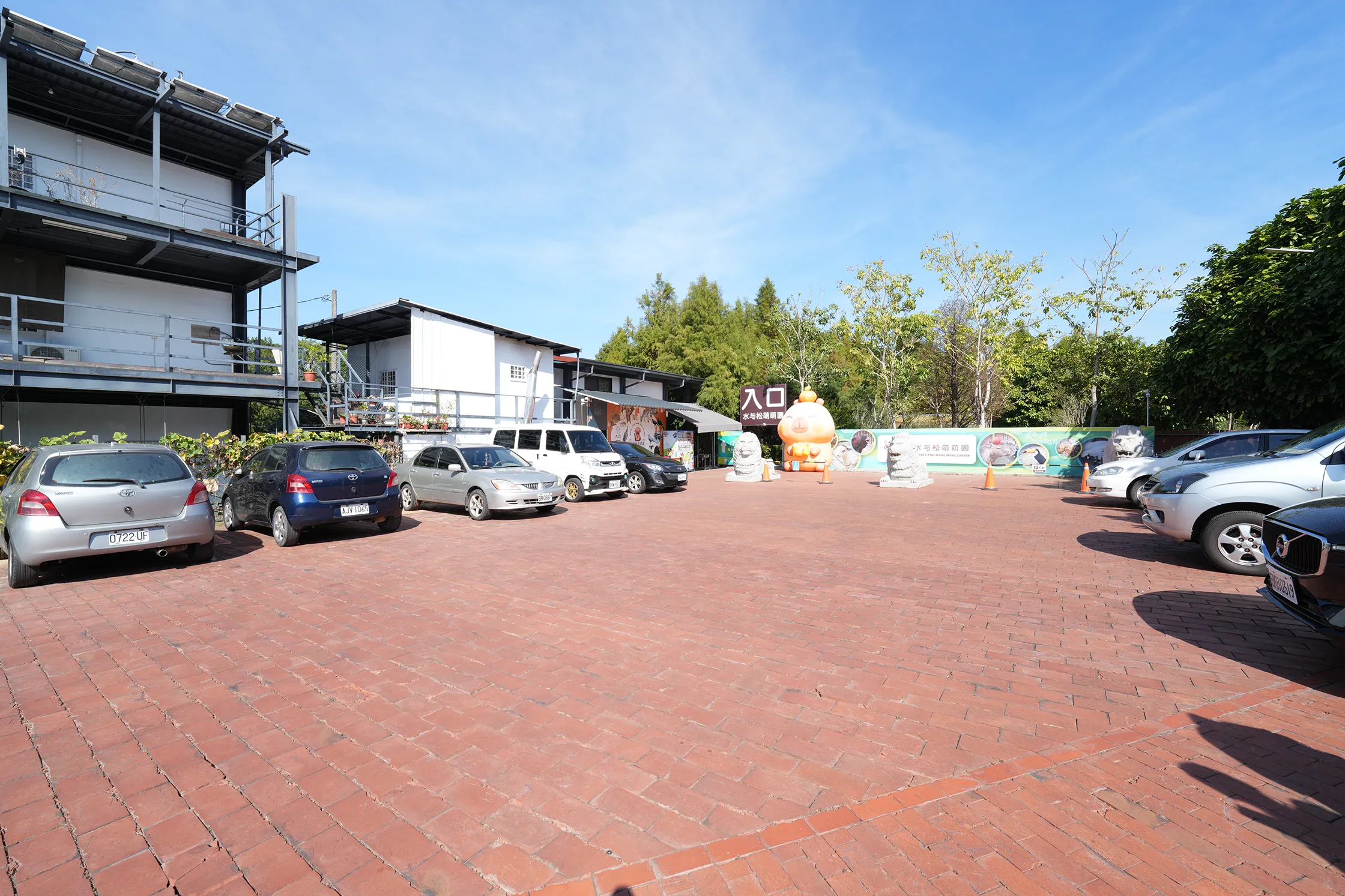 ▼「水与松萌萌園」有自己的停車場,這是P2側門停車場,不知為何這裡還放了2尊石獅子,稍稍有些違和。