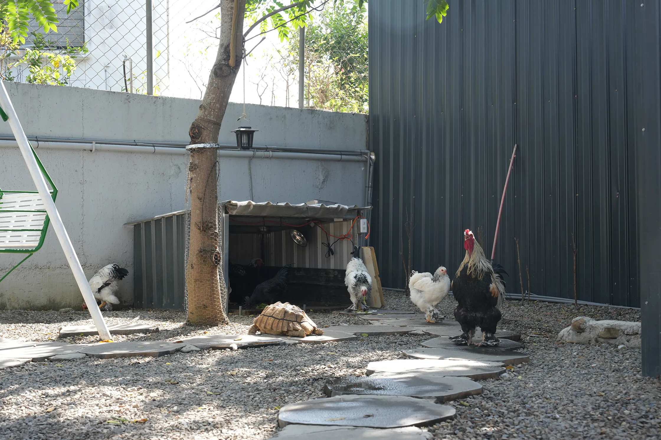 ▼外面還有一區放養區,那隻雄赳赳氣昂昂的雞是公的「梵天雞」,其他白色的為母雞,本來想去看烏龜還有點害怕公的梵天雞(看起來就不好惹),但還好牠們都很和善。