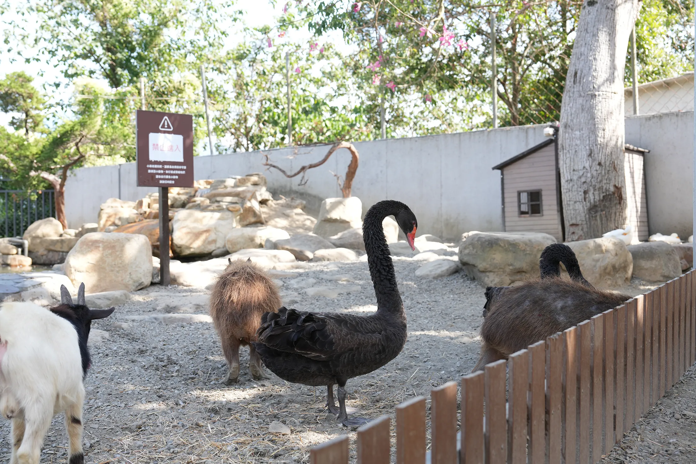 C2區應該會是最多小朋友喜歡而且互動性高的區域啦,這裡主打可以跟侏儒羊、水豚餵食互動,另外水池旁還能看到鴛鴦、天鵝跟柯爾鴨。