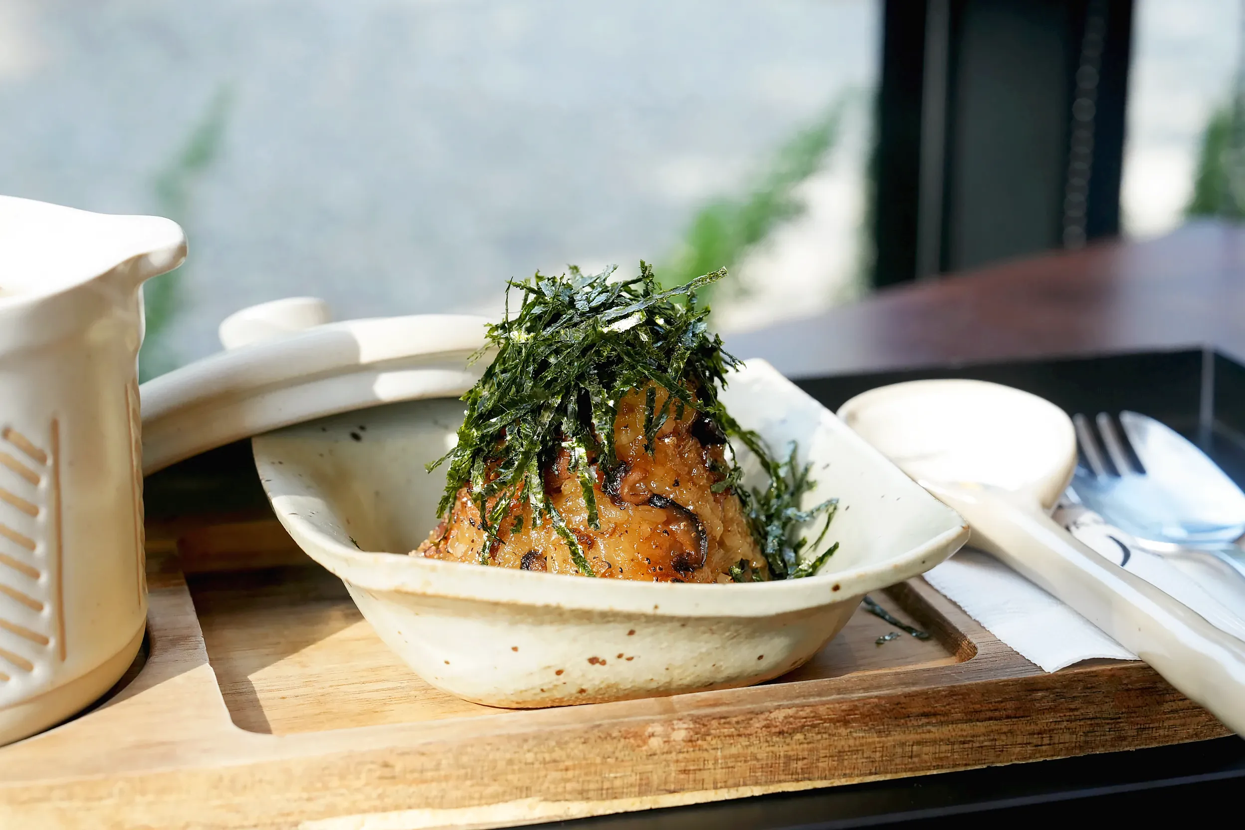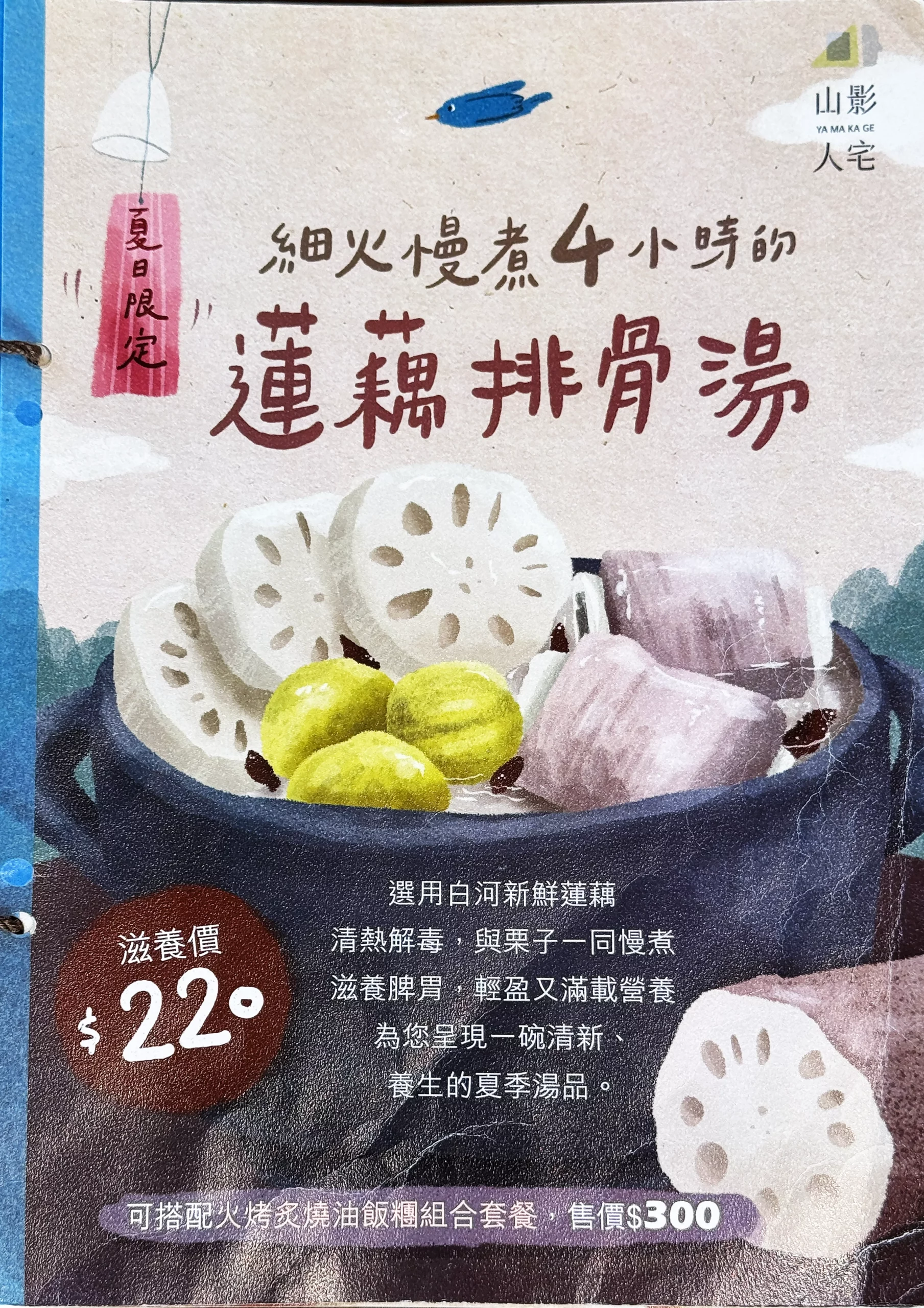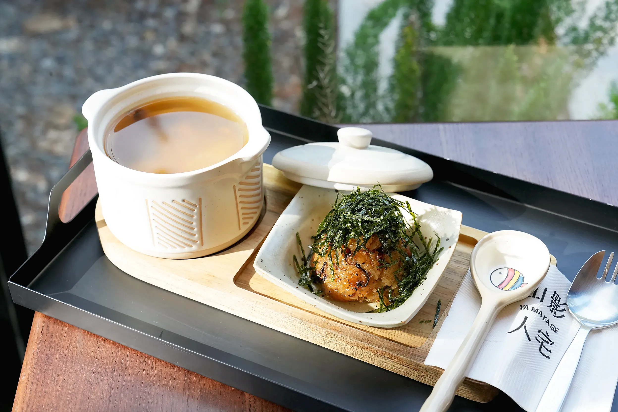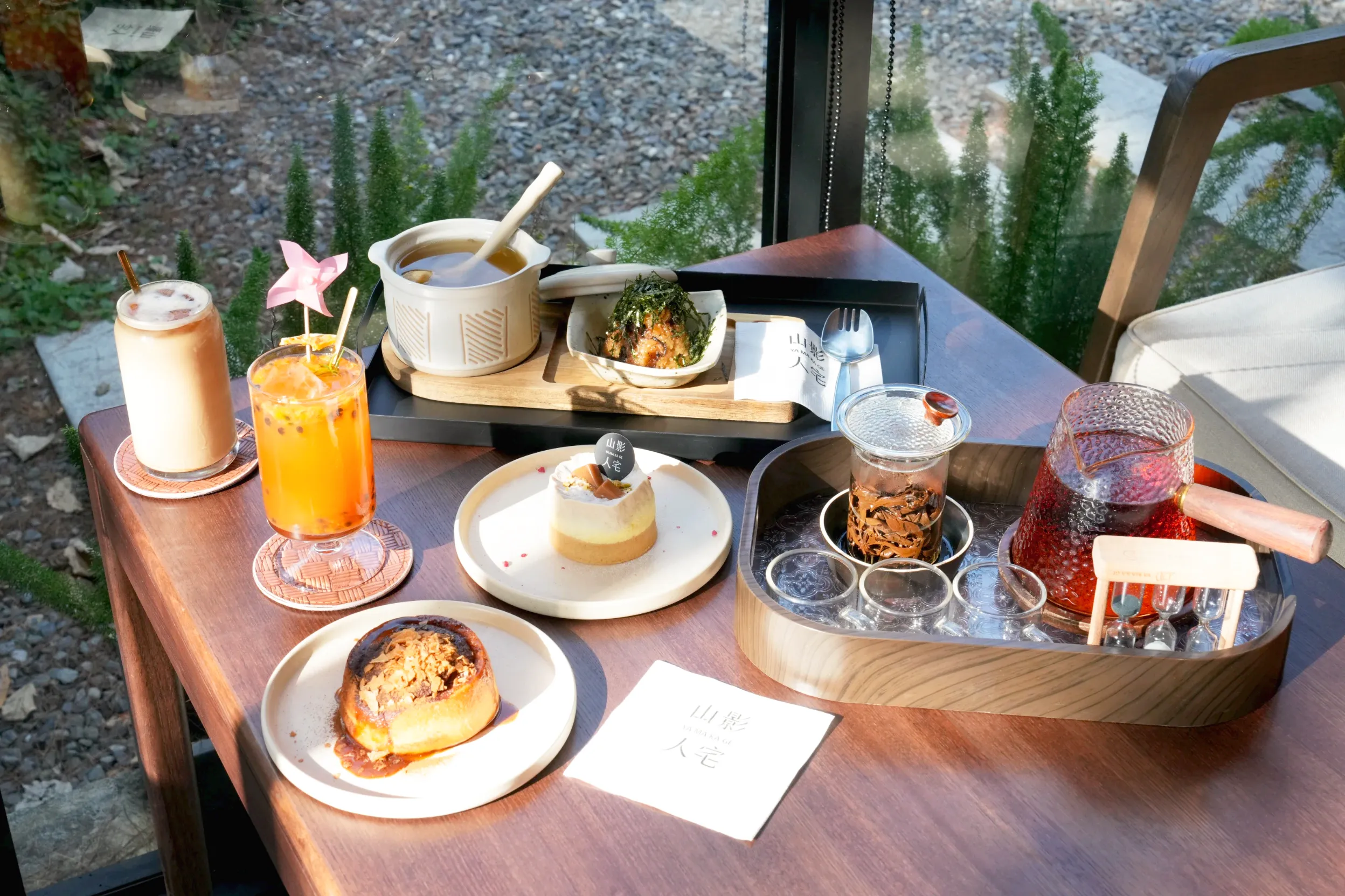 「山影人宅」周遭巧秒的大樹和藤蔓遮擋,形成一個與世隔絕、被大自然包圍的秘境,除了日系風的玻璃屋咖啡廳以外,還有水池和露營風的戶外座位,是一個可以充分吸收芬多精的好地方~咖啡廳的餐點選擇非常多樣,不只好看好拍,也很好吃,我個人最喜歡的是除了飲品甜點以外,還有能夠填飽肚子的飯糰、湯品可以享用,而且價格沒有很貴,CP值非常高。