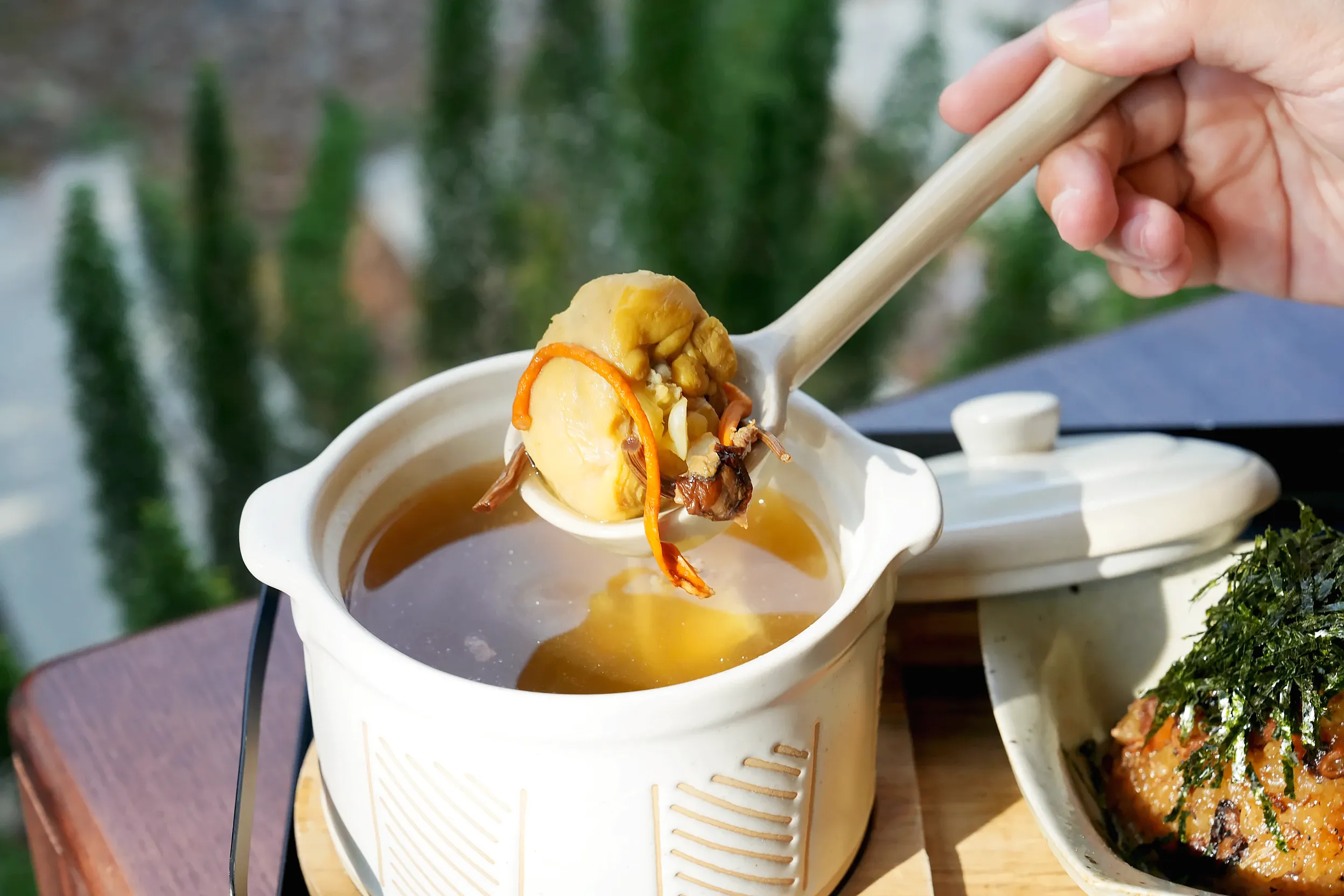 「阿公阿嬤的電影院套餐」包括一顆火烤炙燒油飯糰和一碗什菌菇雞湯,飯糰本身的口味稍微重一點,搭配清爽的雞湯剛剛好,飯糰的份量和雞湯的料都很多,整個套餐非常有飽足感~