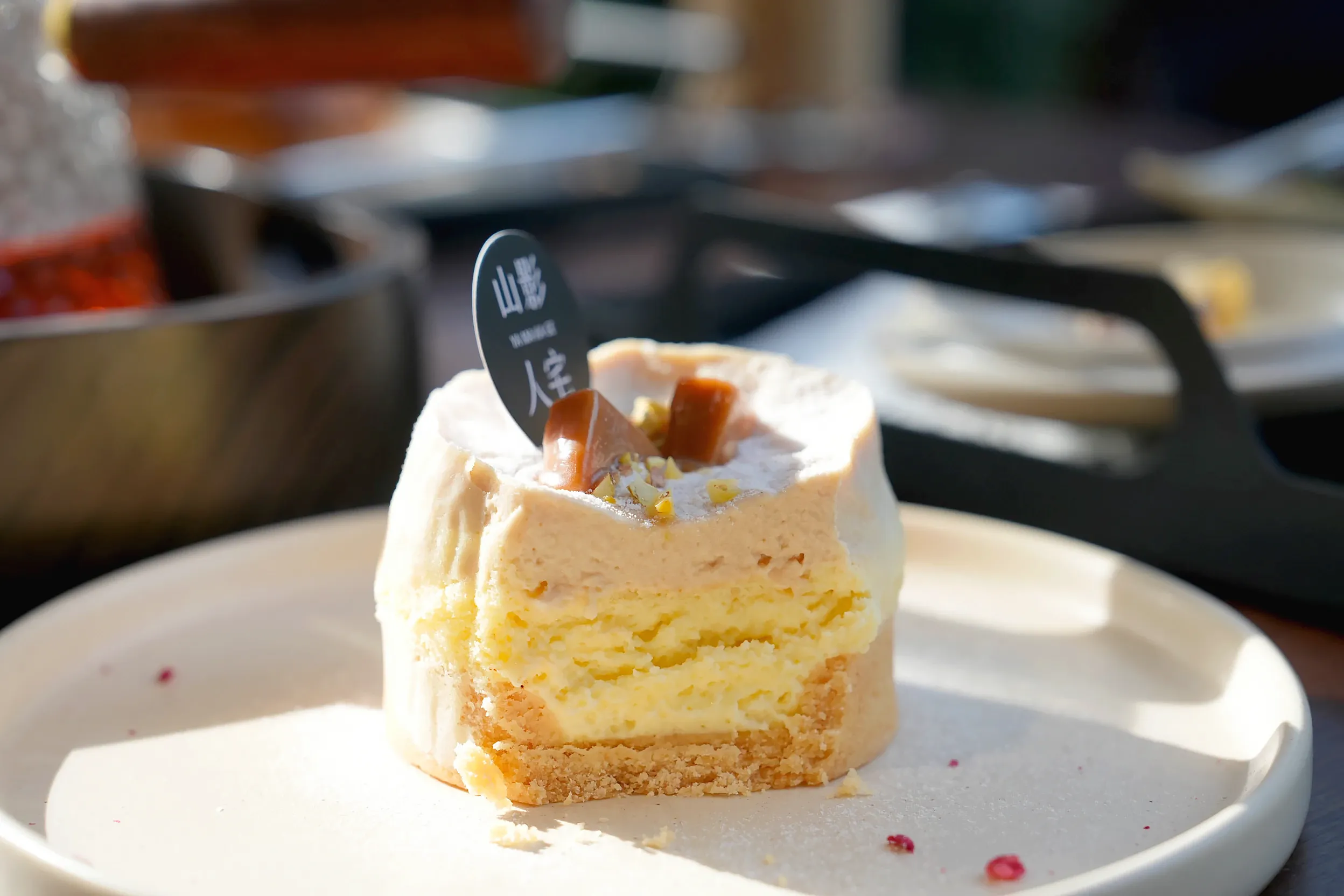 「森永牛奶糖乳酪塔」是屬於可遇而不可求的當日甜點,不一定天天都有。從外觀就可以看到上面有擺著切成兩半的牛奶糖裝飾,裡面有滿滿的內餡,下層是比較酥脆的塔皮,整體吃起來比較多乳酪味,牛奶糖的味道有點不明顯,拍照起來非常上相的精緻甜點。