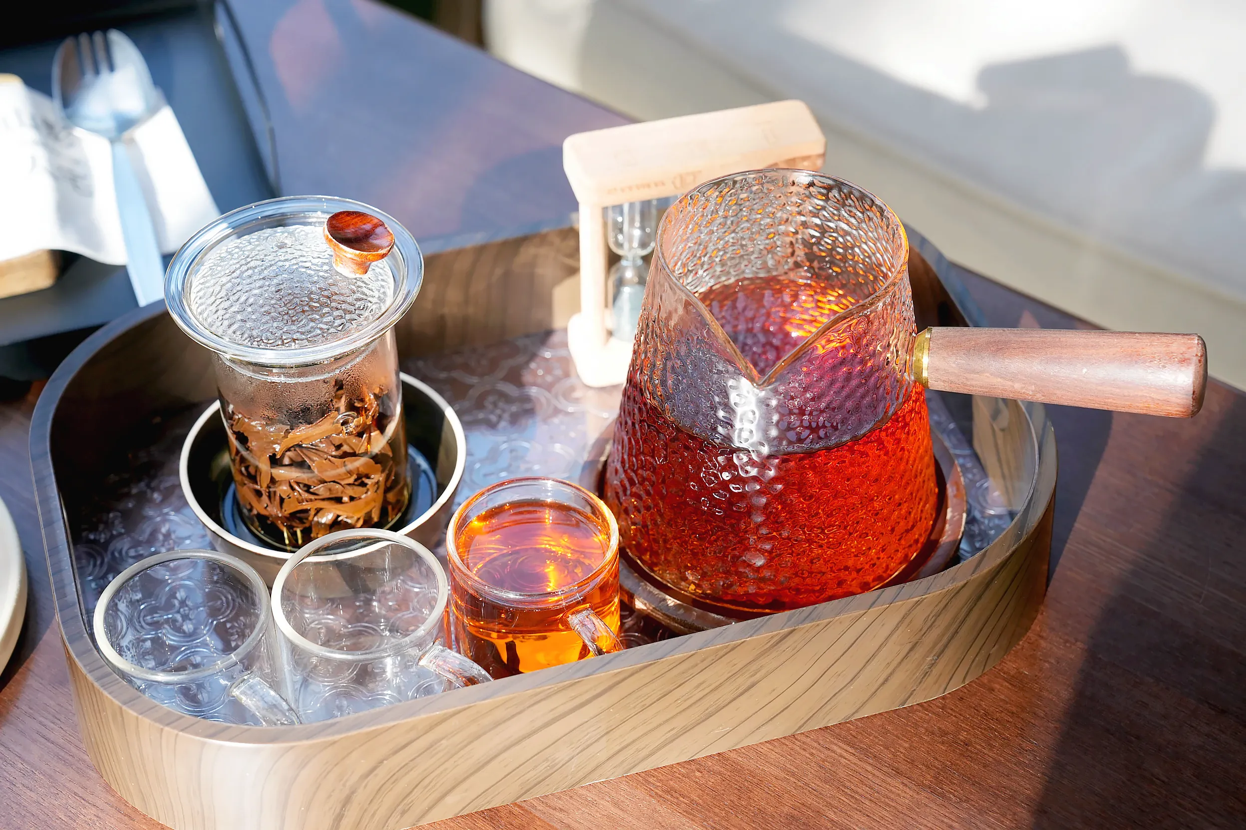 店家很貼心的提供一人一個玻璃杯,並且有特別交代要計時,以防茶葉浸泡太久影響風味。台茶21號紅韻紅茶的茶香濃郁,喝起來清甜順口,完全不會澀,很適合搭配甜點。
