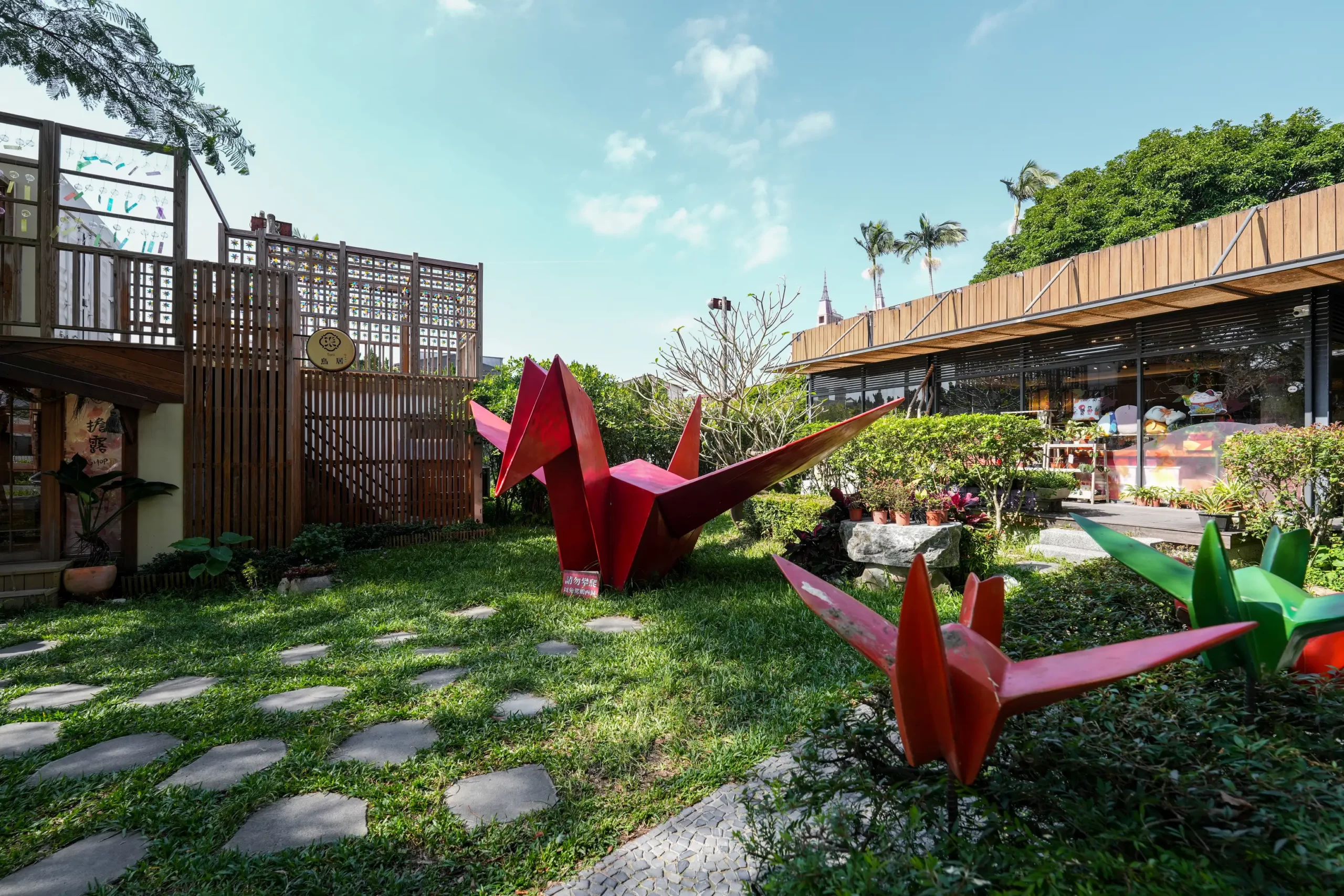 「鳥居喫茶食堂」前身是日治時期台糖的所長宿舍,如今搖身一變,成為全台唯一以祈福為主題的日式餐廳,整體環境充滿濃厚的日式氛圍,除了入口處有兩層樓高的巨大鳥居,沿途還能看見手水舍、風鈴牆等很有氛圍感的造景,彷彿讓人踏進一幕幕日式場景之中,而且店家還開放免費參觀,讓所有遊客都可以自由走走逛逛、拍拍美照。