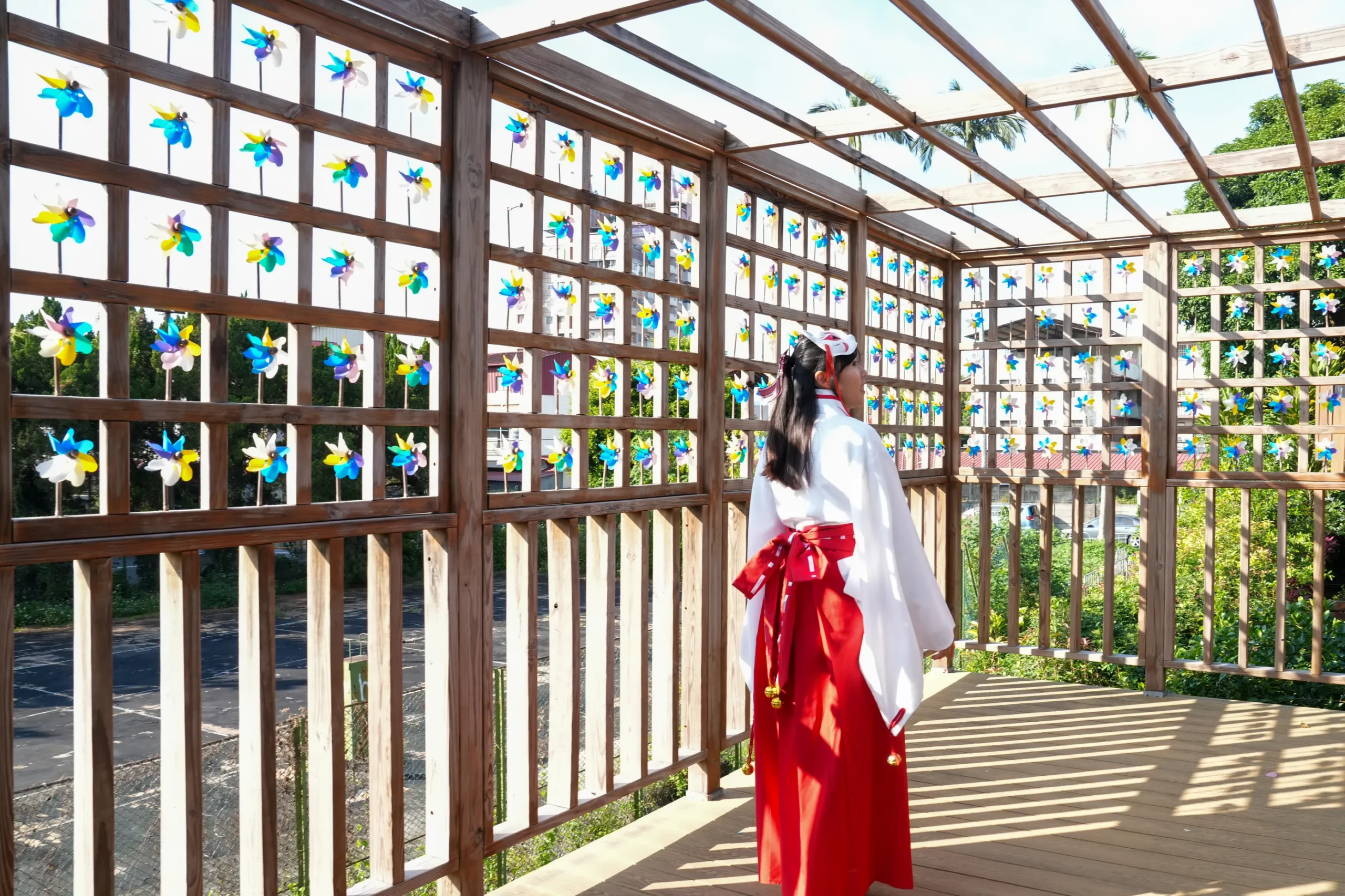 「鳥居喫茶食堂」,整體環境清幽,園區開放免費參觀,除了入口處有一座高達兩層樓的巨大鳥居,沿途還能看見手水舍、繽紛風車牆等日式造景,讓所有遊客都可以盡情拍照打卡、感受濃濃的日式氛圍。園內也有提供餐點,從火鍋、精緻的日式套餐,到兒童餐應有盡有,選擇相當豐富。此外,「鳥居喫茶食堂」的浴衣體驗價格真的非常親民,款式選擇也很豐富,尺寸從小朋友到大人都有,甚至還有提供寵物浴衣,現場會有專人協助穿戴,髮飾、配件和木屐也都可以免費搭配使用,不過當天替我們服務的工作人員可能還不太熟練,下身的部分有幾次沒固定好,需要反覆調整才能完成著裝,雖然有這個小小的狀況,但整體體驗仍然不錯,蠻推薦可以帶著全家人或毛小孩一起來這裡走走,換上浴衣並體驗一下療癒的日式氛圍。