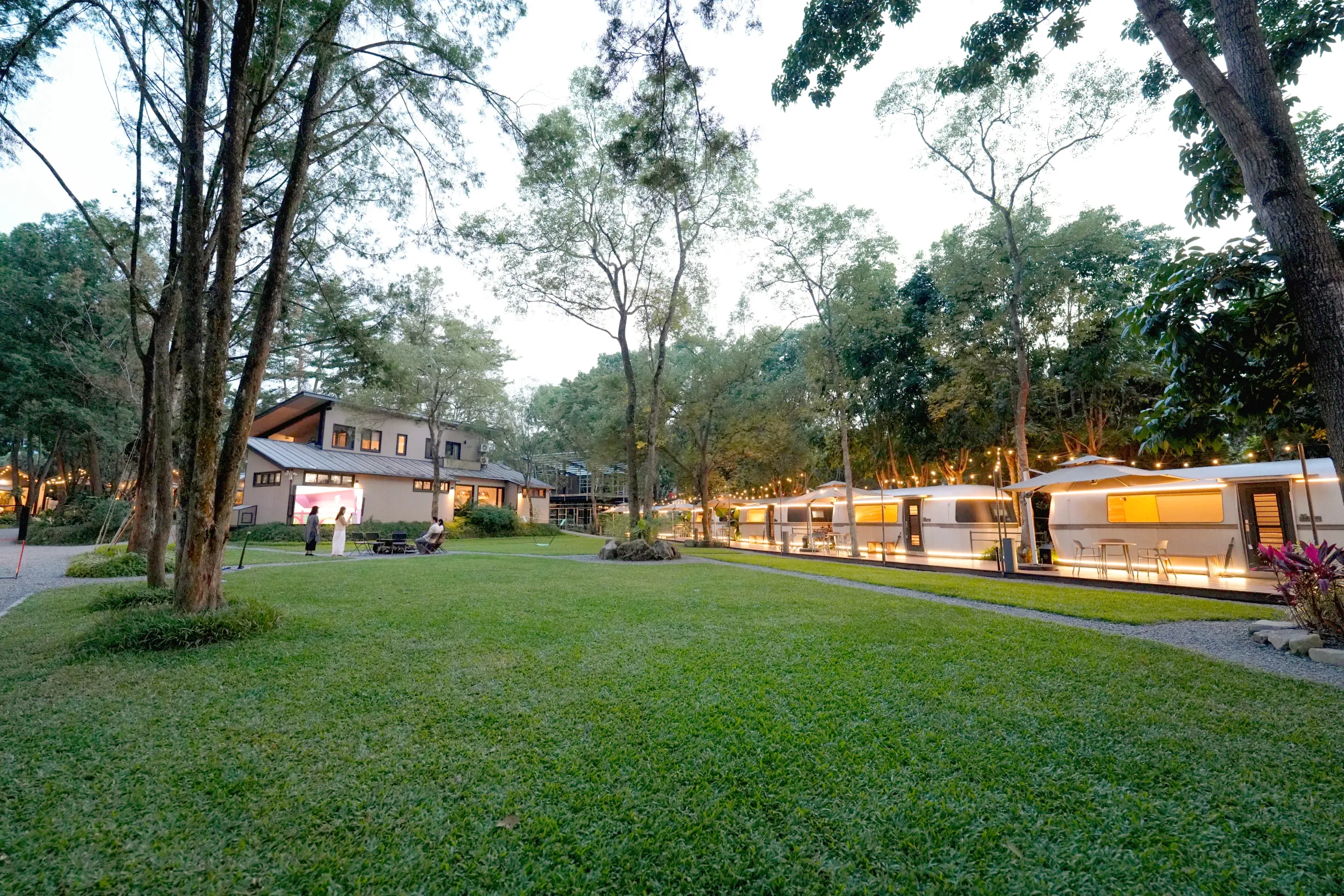 ▼TOP露營車區域的旁邊有很適合寵物和小孩放電的大草皮區,晚上點燈後也別有一番風味,還有星光電影院可以看喔!